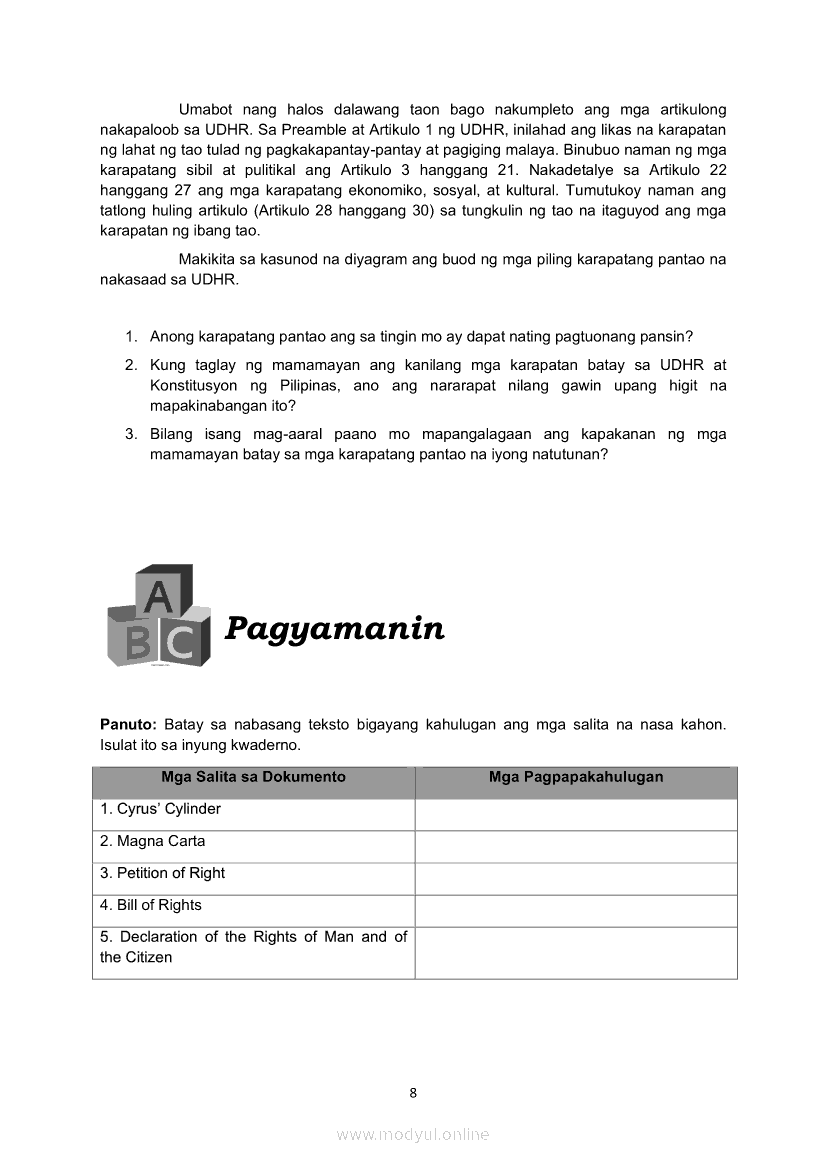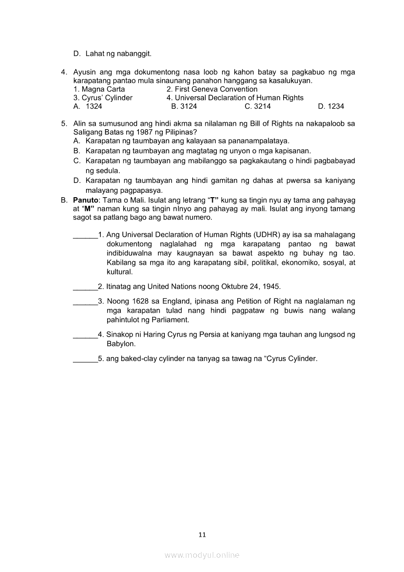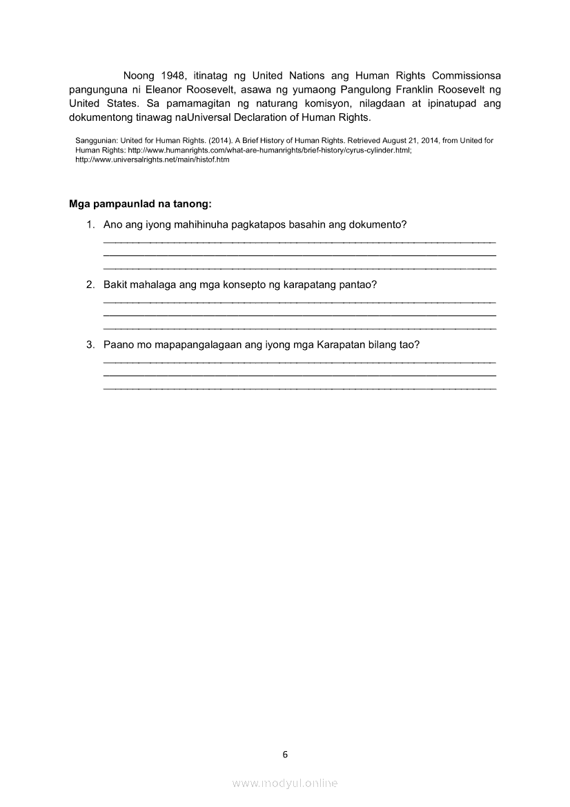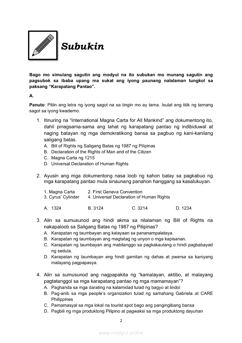 Araling Panlipunan Ikaapat na Markahan – Modyul 3 Mga Karapatang PantaoMay 28, 2021 Grade 10Xiaomi Redmi Watch 5 Active 2inch LCD Display Clear Calling 5ATM Waterproof Smart Watch for only ₱3,999 ₱1,200!. Araling Panlipunan 10 4th QuarterRelatedAraling Panlipunan Ikaapat na Markahan – Modyul 8 Mabuting Pamamahala o Good GovernanceAraling Panlipunan Ikaapat na Markahan – Modyul 6 Paglahok Sa Civil SocietyAraling Panlipunan Ikaapat na Markahan – Modyul 1 Pagkamamamayan: Konsepto at KatuturanAraling Panlipunan Ikaapat na Markahan – Modyul 2 Lumawak Na Pananaw ng PagkamamamayanAraling Panlipunan Ikaapat na Markahan – Modyul 4 Ang mga Karapatang Pantao at ang Pagkamamayan