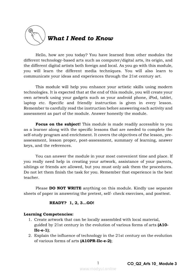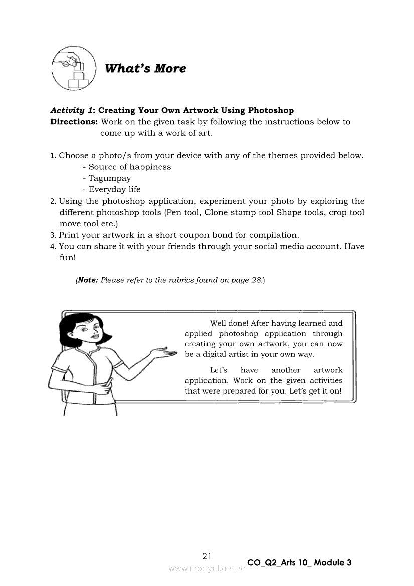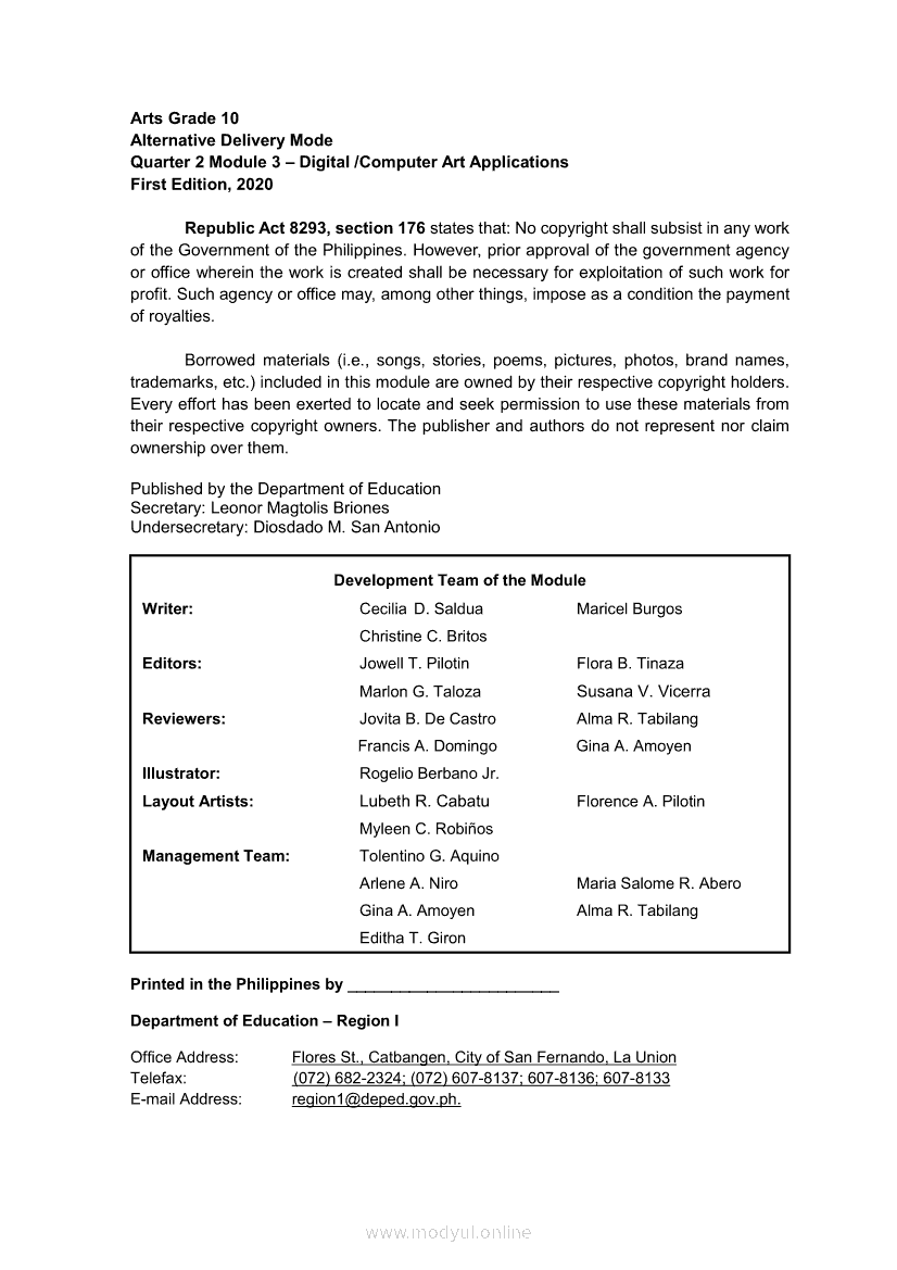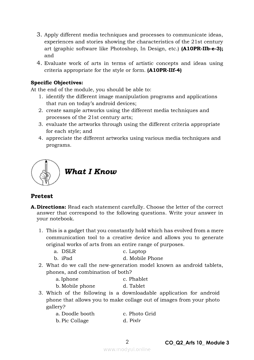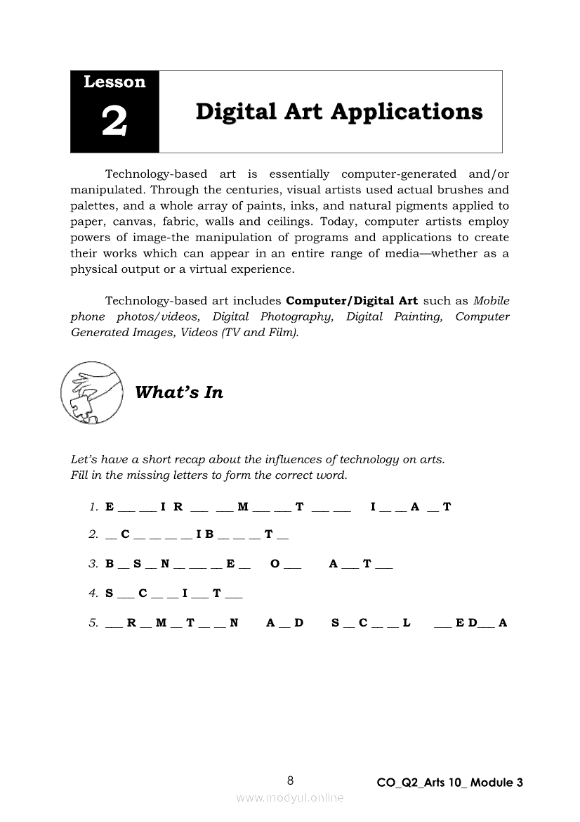 Arts 10 Quarter 2 – Module 3: Digital/Computer Art ApplicationsApr 22, 2021 Grade 10Xiaomi Redmi Watch 5 Active 2inch LCD Display Clear Calling 5ATM Waterproof Smart Watch for only ₱3,999 ₱1,200!. Arts 10RelatedARTS Quarter 4 – Module 4a: Original Performance with the Use of MediaARTS Quarter 4 – Module 4b: Original Performance With the Use of MediaArts 10 Module 1: Principles of Design and Elements of ArtsArts 10 Module 2: Characteristics of Arts from the Various Art MovementsArts 10 Module 3: The Modern Filipino Artists and Their Works