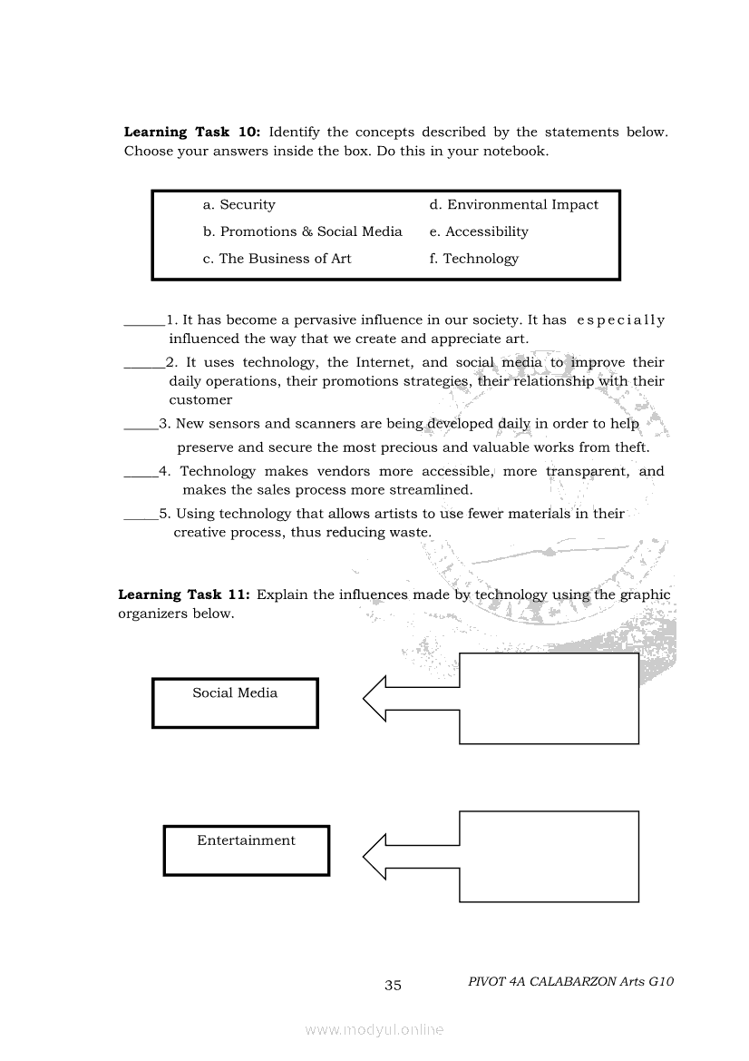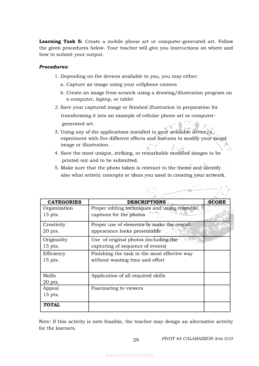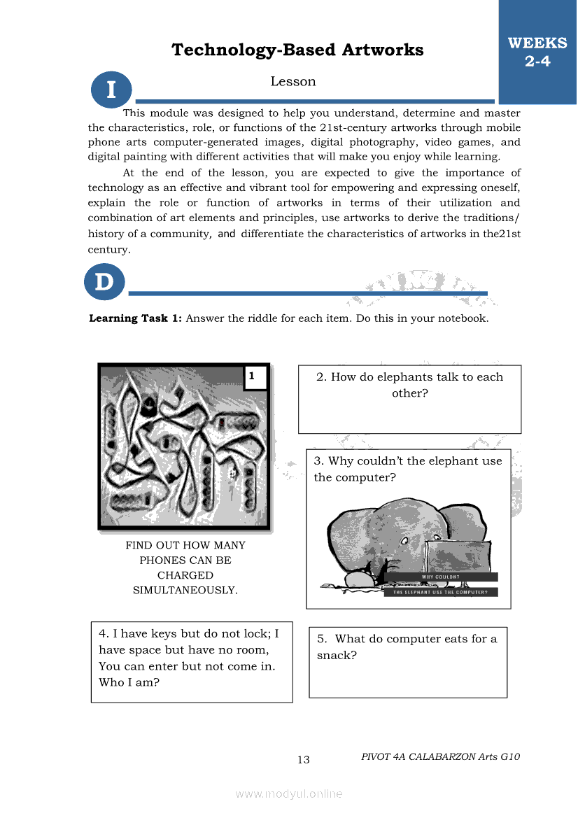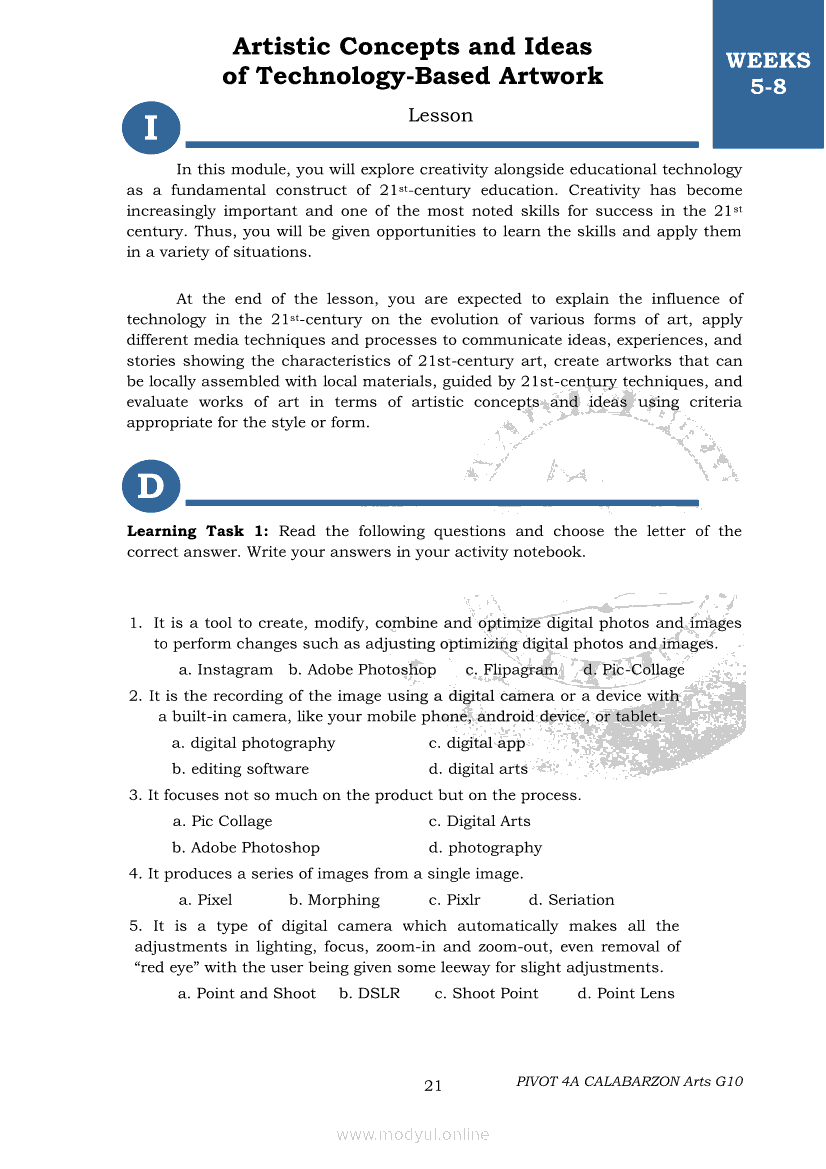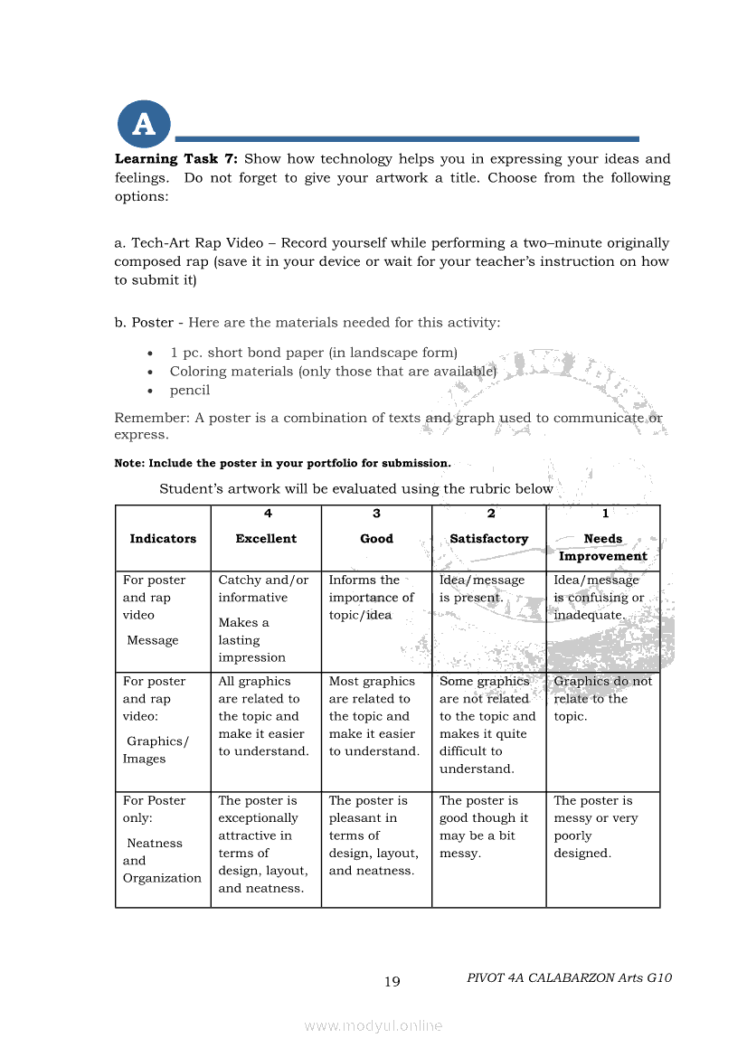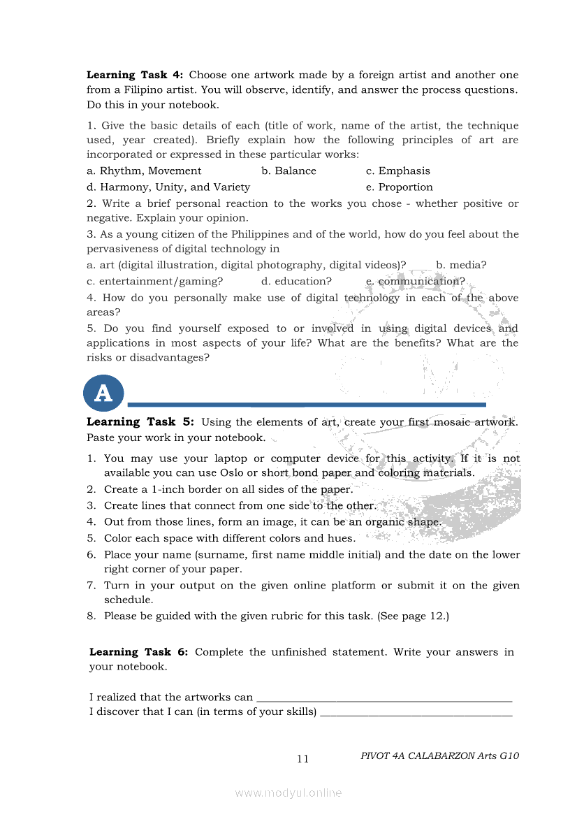 Arts 10 Second Quarter Module (PIVOT)Apr 22, 2021 Grade 10Xiaomi Redmi Watch 5 Active 2inch LCD Display Clear Calling 5ATM Waterproof Smart Watch for only ₱3,999 ₱1,200!. Arts 10RelatedARTS Quarter 4 – Module 4a: Original Performance with the Use of MediaARTS Quarter 4 – Module 4b: Original Performance With the Use of MediaArts 10 Module 1: Principles of Design and Elements of ArtsArts 10 Module 3: The Modern Filipino Artists and Their WorksArts 10 Module 5: Modern Arts: Media Techniques and Processes