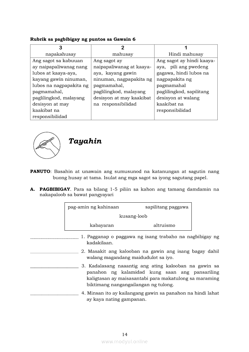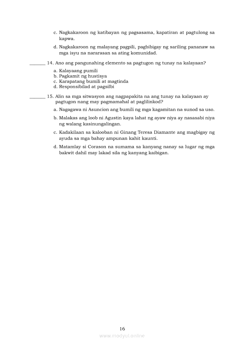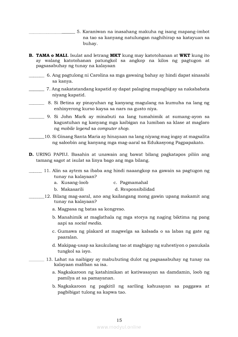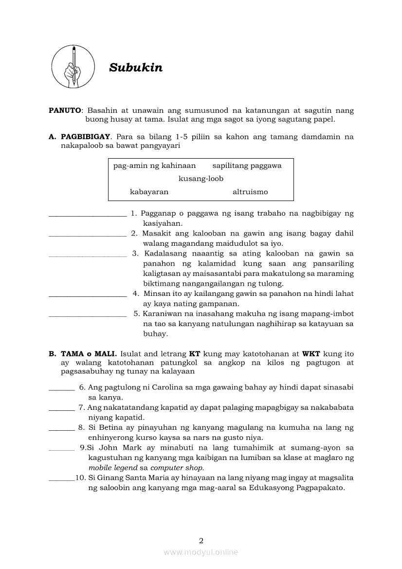 Edukasyon sa Pagpapakatao 10 Modyul 7: Pagmamahal at PaglilingkodTugon sa Tunay na KalayaanApr 22, 2021 Grade 10Xiaomi Redmi Watch 5 Active 2inch LCD Display Clear Calling 5ATM Waterproof Smart Watch for only ₱3,999 ₱1,200!. Edukasyon sa Pagpapakatao 10RelatedEdukasyon sa Pagpapakatao Ikaapat na Markahan – Modyul 2b: Kahalagahan ng Paggalang sa Dignidad at Sekswalidad Ikaapat na LinggoEdukasyon sa Pagpapakatao Ikaapat na Markahan – Modyul 1b: Tamang Paggamit ng Kapangyarihan at Pangangalaga sa Kalikasan Ikalawang LinggoEdukasyon sa Pagpapakatao Ikaapat na Markahan – Modyul 3b: Isyu sa Kawalan ng Paggalang sa Katotohanan Ikaanim na LinggoEdukasyon sa Pagpapakatao Ikaapat na Markahan – Modyul 2a: Isyu sa Kawalan ng Paggalang sa Dignidad at Sekswalidad Ikatlong LinggoEdukasyon sa Pagpapakatao Ikaapat na Markahan – Modyul 3a: Isyu sa Kawalan ng Paggalang sa Katotohanan Ikalimang Linggo