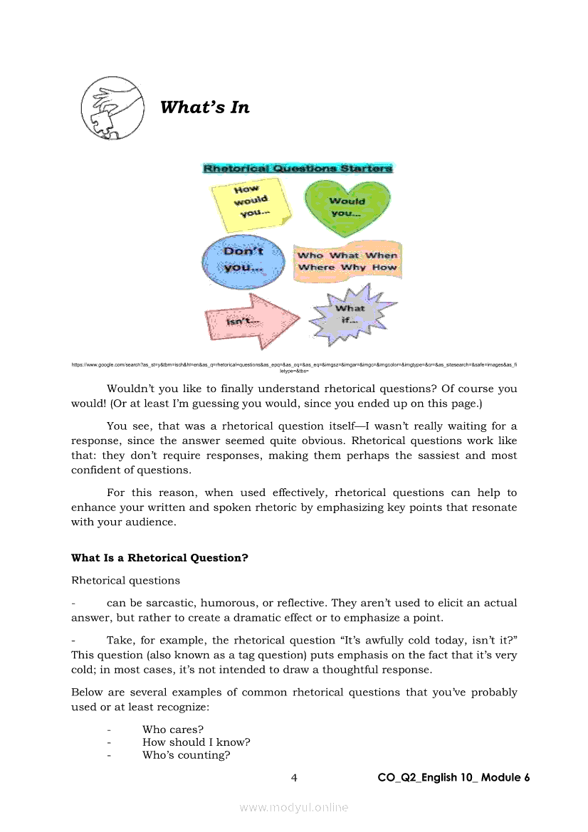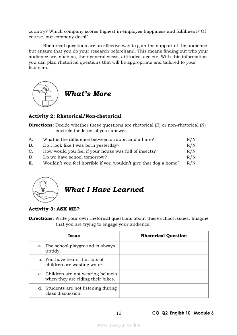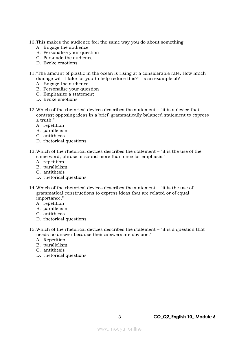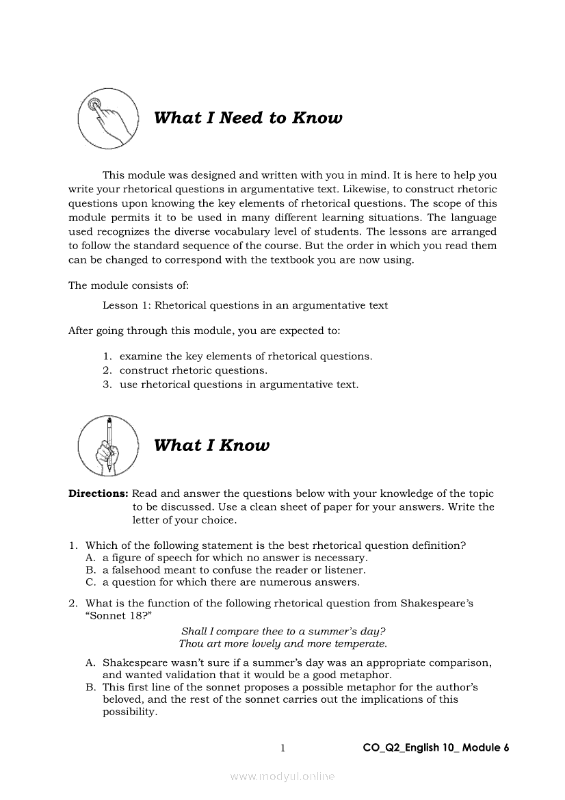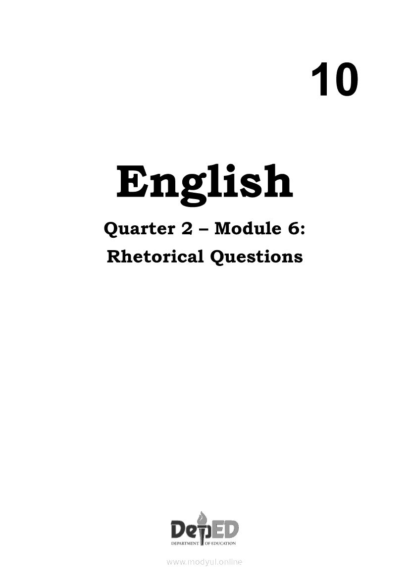 English 10 Quarter 2 – Module 6: Rhetorical QuestionsApr 22, 2021 Grade 10Xiaomi Redmi Watch 5 Active 2inch LCD Display Clear Calling 5ATM Waterproof Smart Watch for only ₱3,999 ₱1,200!. English 10RelatedEnglish Quarter 4 – Module 3: Giving Expanded Definitions of WordsEnglish Quarter 4 – Module 2: Giving Technical and Operational DefinitionsEnglish Quarter 4 – Module 1: Language of ResearchEnglish 10 Second Quarter Module (PIVOT)English 10 Quarter 2 - Module 5: FORMULATING CLAIMS OF FACT, POLICY AND VALUE