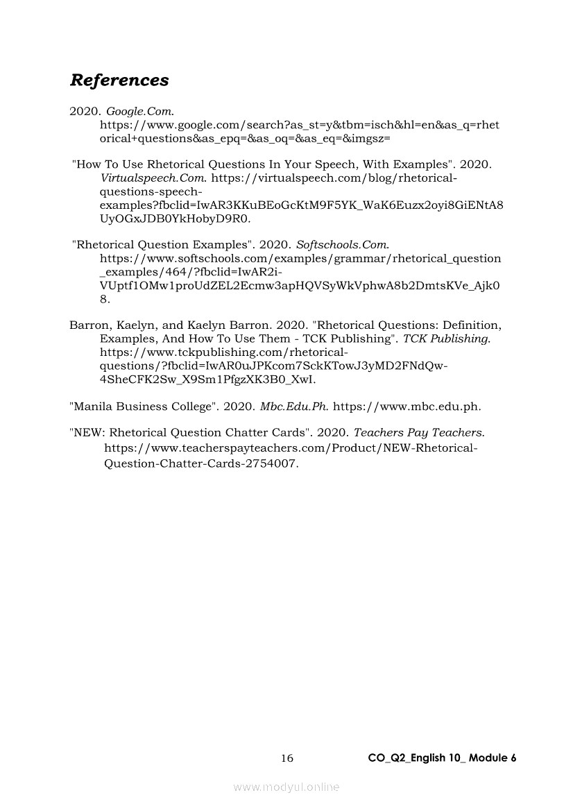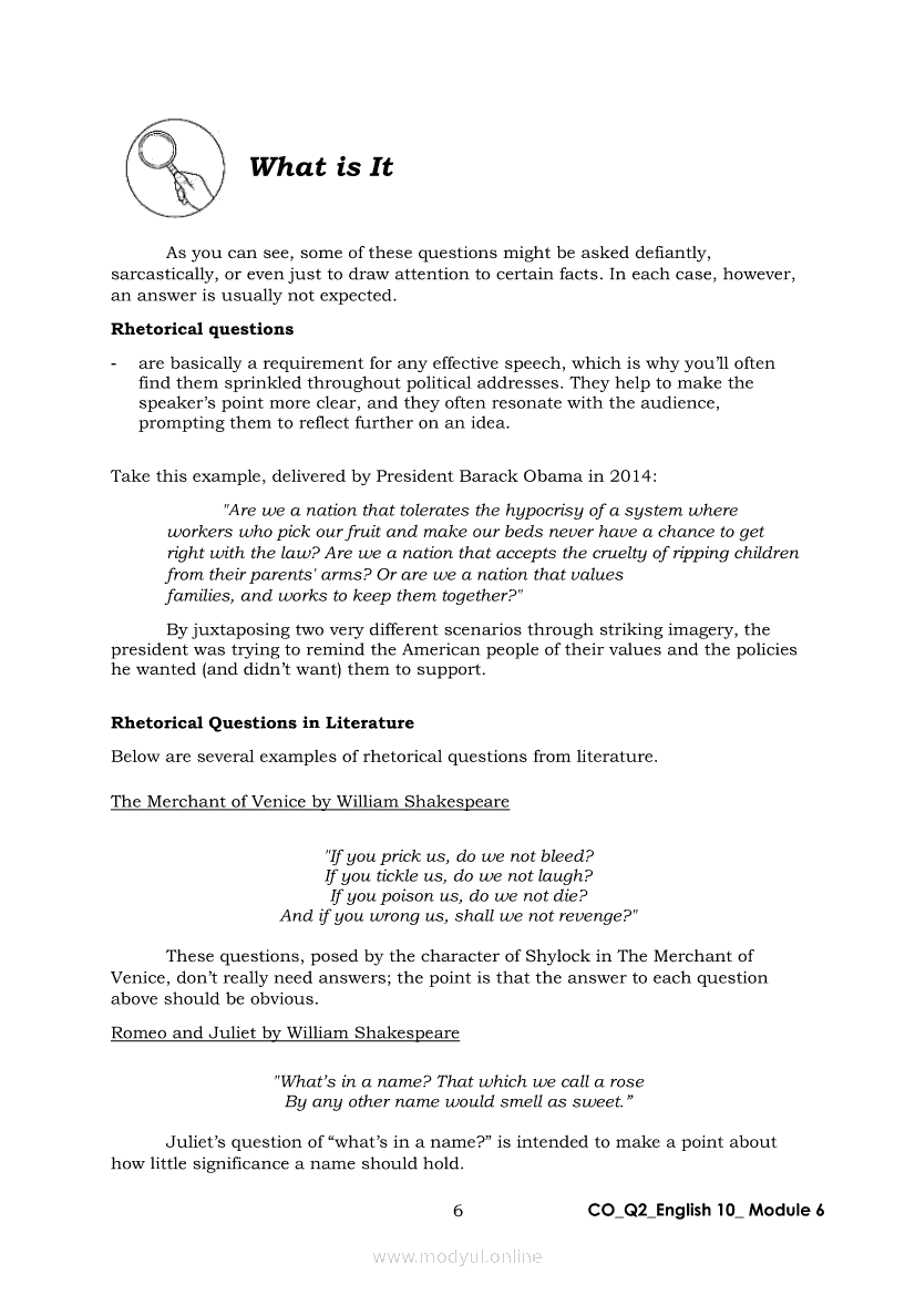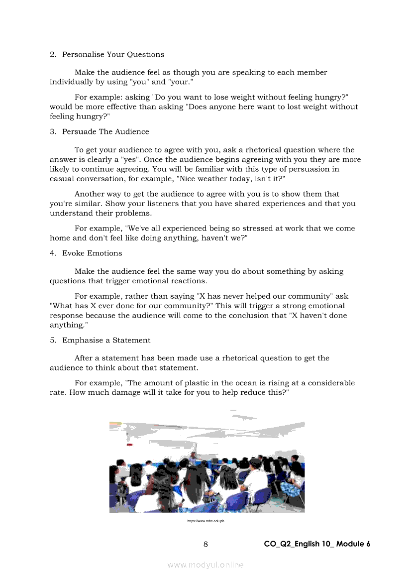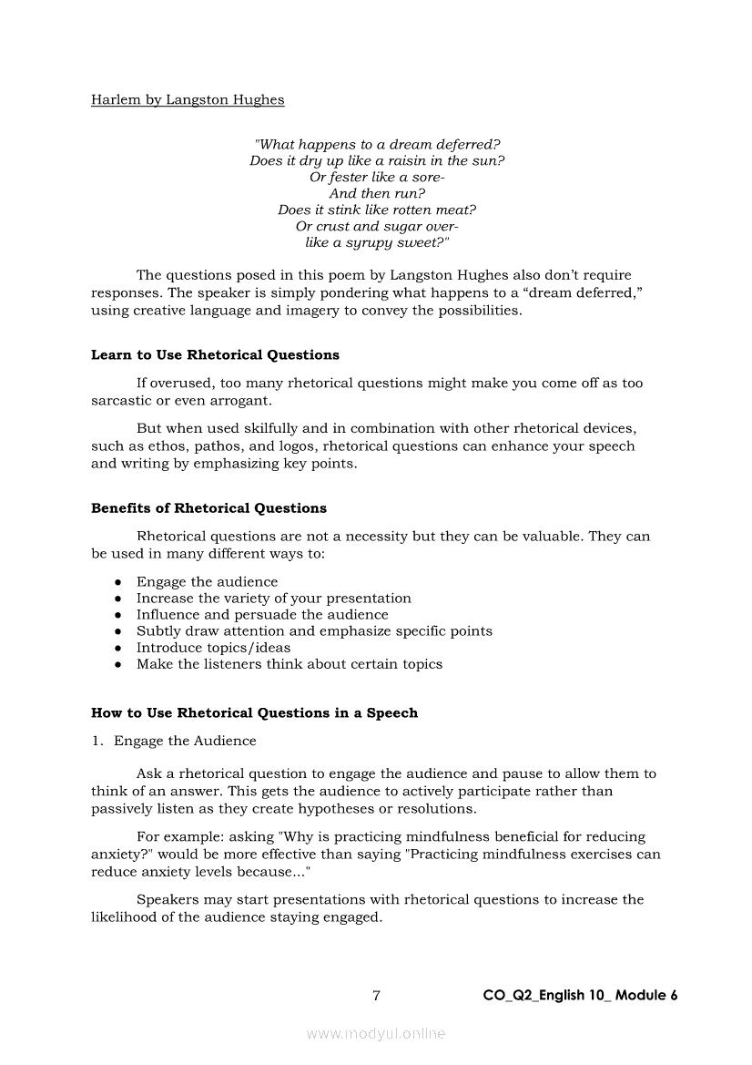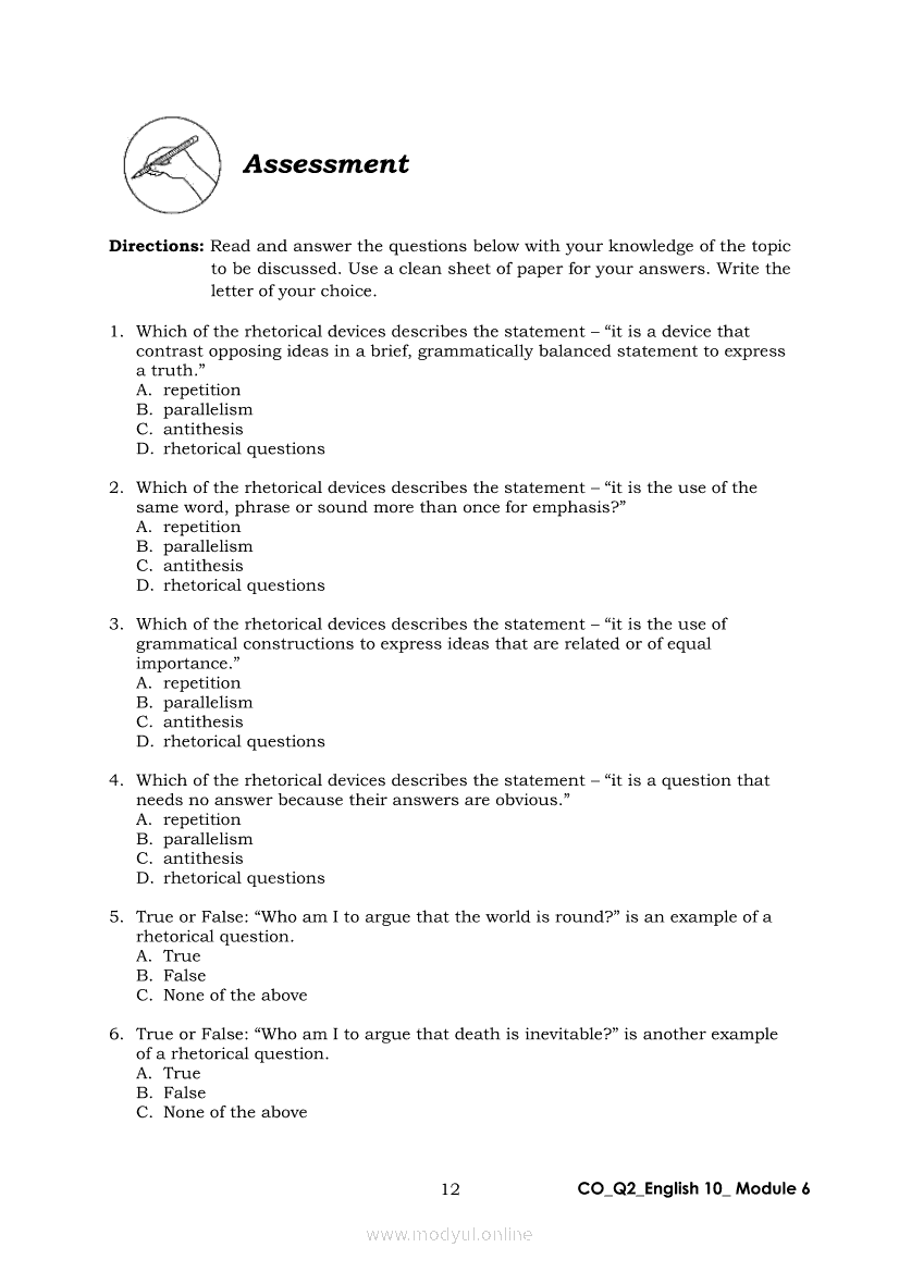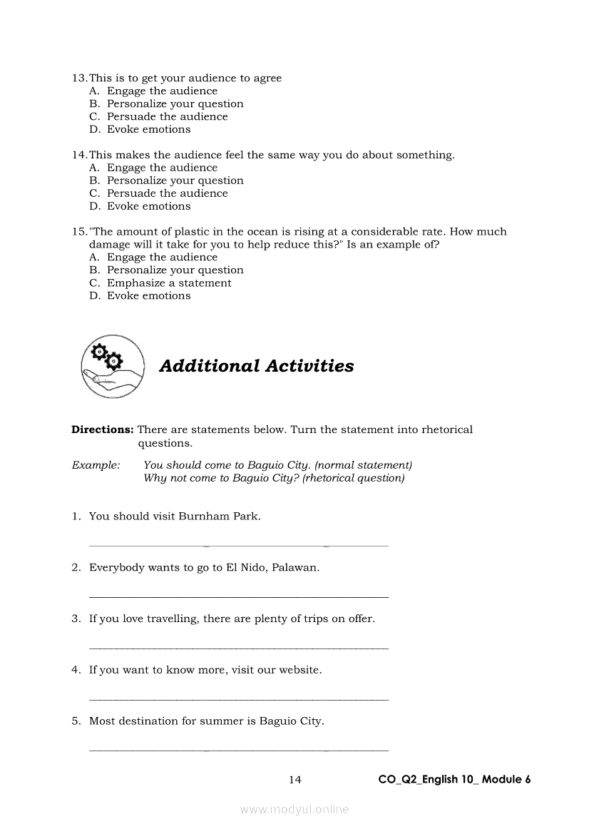 English 10 Quarter 2 – Module 6: Rhetorical QuestionsApr 22, 2021 Grade 10Xiaomi Redmi Watch 5 Active 2inch LCD Display Clear Calling 5ATM Waterproof Smart Watch for only ₱3,999 ₱1,200!. English 10RelatedEnglish Quarter 4 – Module 3: Giving Expanded Definitions of WordsEnglish Quarter 4 – Module 2: Giving Technical and Operational DefinitionsEnglish Quarter 4 – Module 1: Language of ResearchEnglish 10 Second Quarter Module (PIVOT)English 10 Quarter 2 - Module 5: FORMULATING CLAIMS OF FACT, POLICY AND VALUE