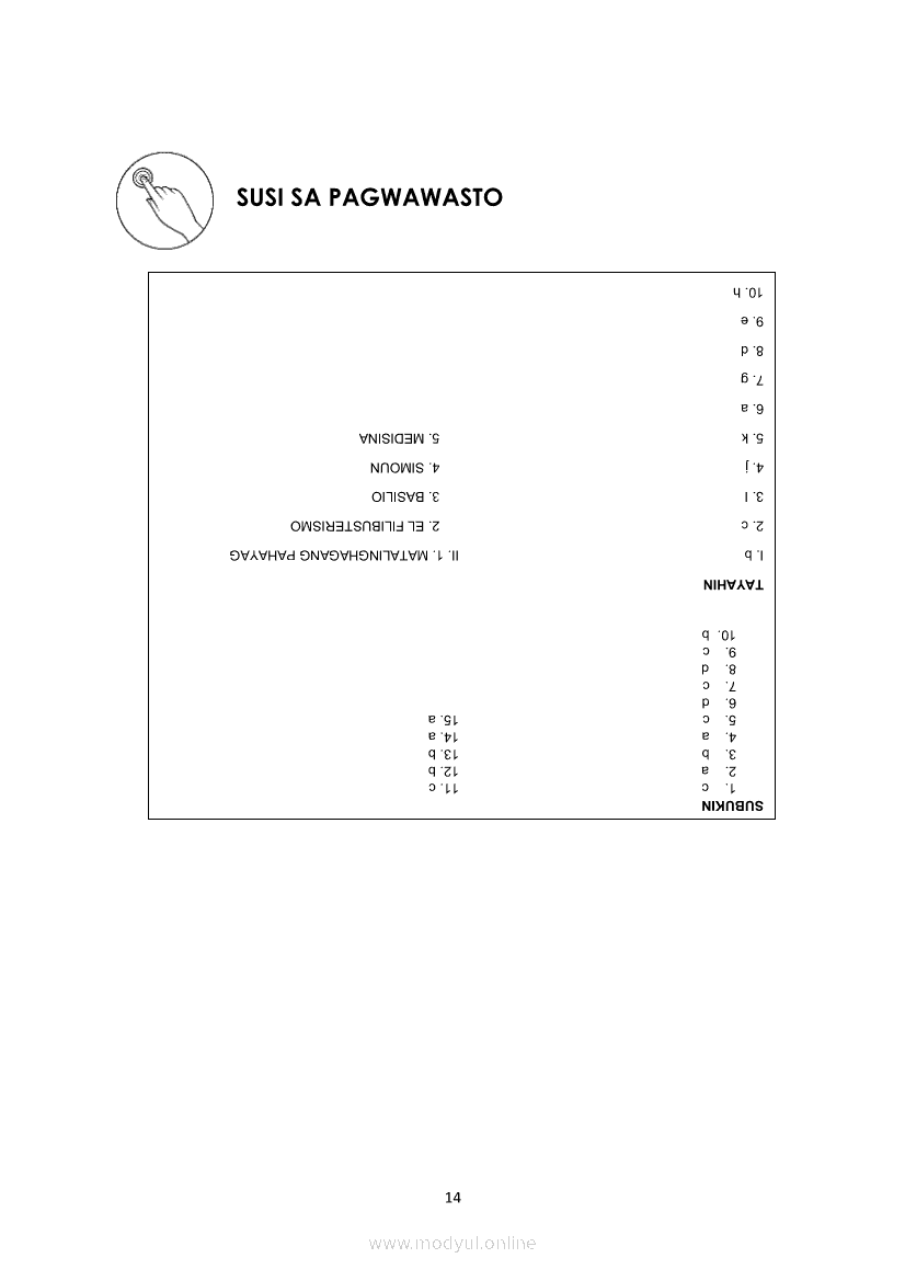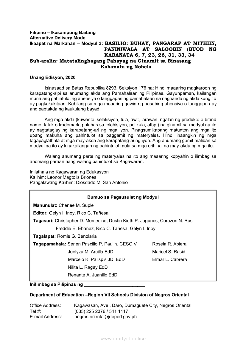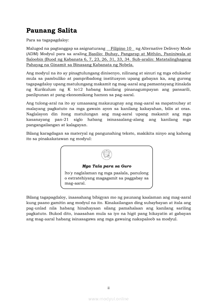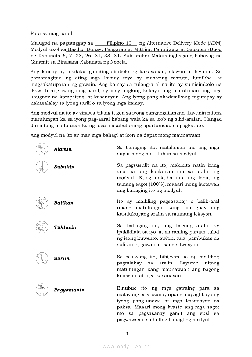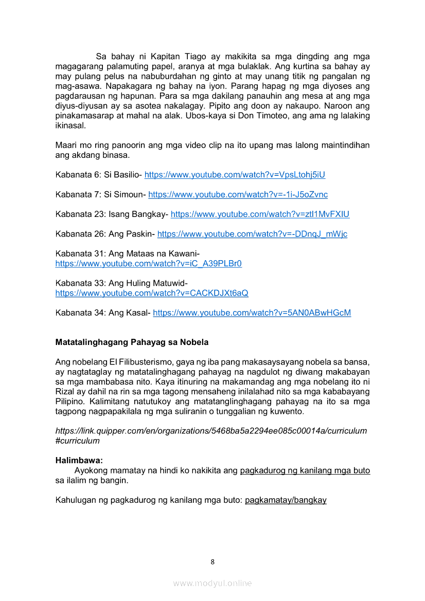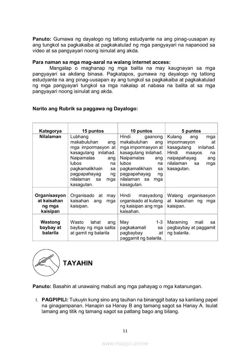 Filipino 10 Ikaapat na Markahan – Modyul 3 BASILIO: BUHAY, PANGARAP AT MITHIIN, PANINIWALA AT SALOOBIN (BUOD NG KABANATA 6, 7, 23, 26, 31, 33, 34 Sub-Aralin: Matatalinghagang Pahayag na Ginagamit sa Binasang Kabanata ng NobelaMay 28, 2021 Grade 10Xiaomi Redmi Watch 5 Active 2inch LCD Display Clear Calling 5ATM Waterproof Smart Watch for only ₱3,999 ₱1,200!. 4th QuarterRelatedFilipino 10 Ikaapat na Markahan – Modyul 6 PAGPAPAHALAGA SA MGA KAISIPANG LUTANG MULA SA BINASANG AKDA (Sa ilalim ng Kubyerta, Ang mga Alamat at Ang Wakas) Sub-Aralin: Mga Salitang Hudyat sa Pagpapahayag ng Saloobin o DamdaminAraling Panlipunan Ikaapat na Markahan – Modyul 2 Lumawak Na Pananaw ng PagkamamamayanTLE - HE - DRESSMAKING Quarter 4 - Module 2: Sew and Assemble the Lady’s TrousersTLE - HE - HAIRDRESSING Quarter 4 - Module 1: APPLYING MAKE-UPFilipino 10 Ikaapat na Markahan – Modyul 4 PAGSUSURI SA PILING KABANATA NG EL FILIBUSTERISMO Sub-Aralin: Pagbubuod Gamit ang Tamang Mekaniks sa Pagsulat