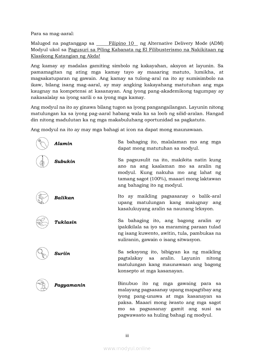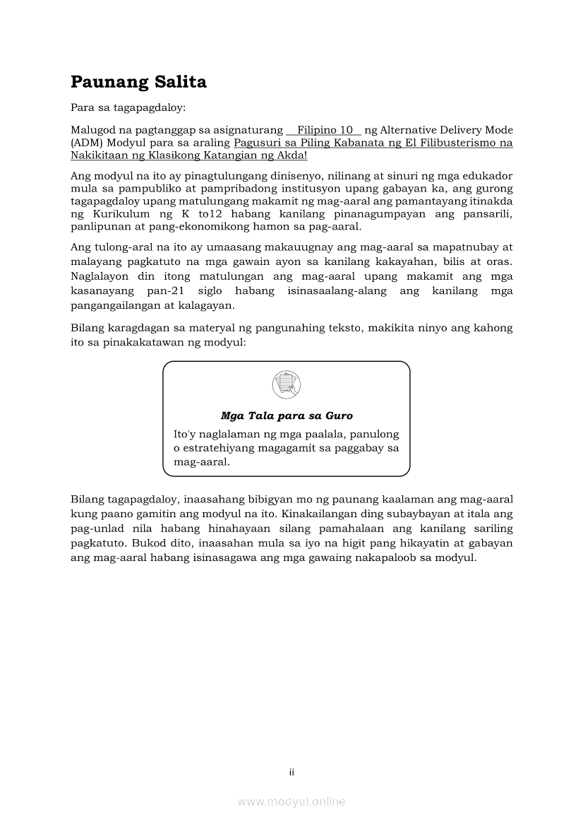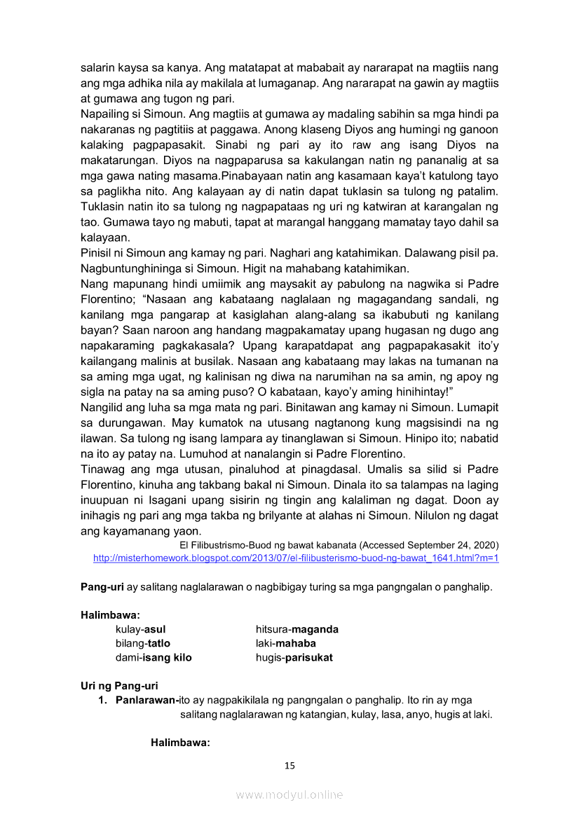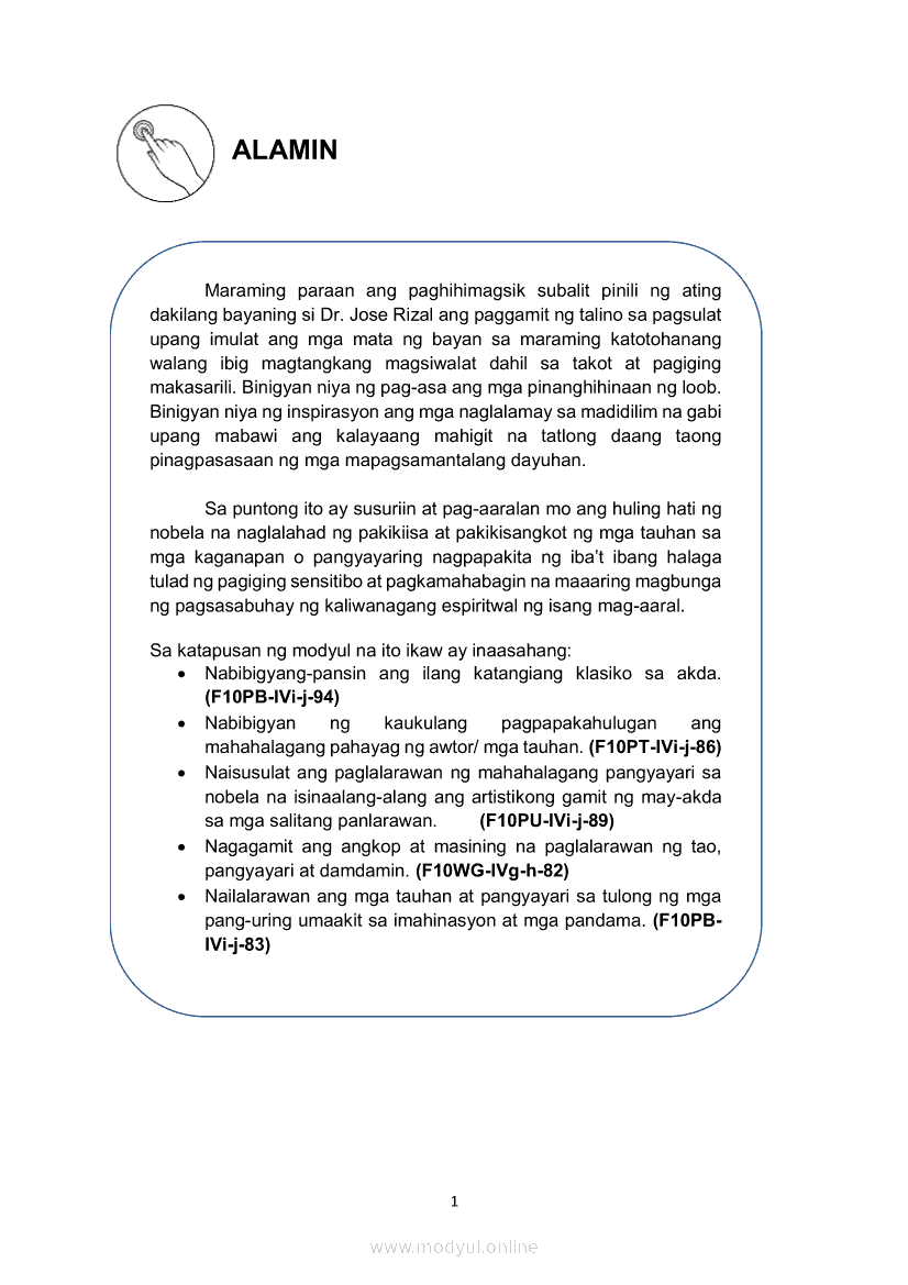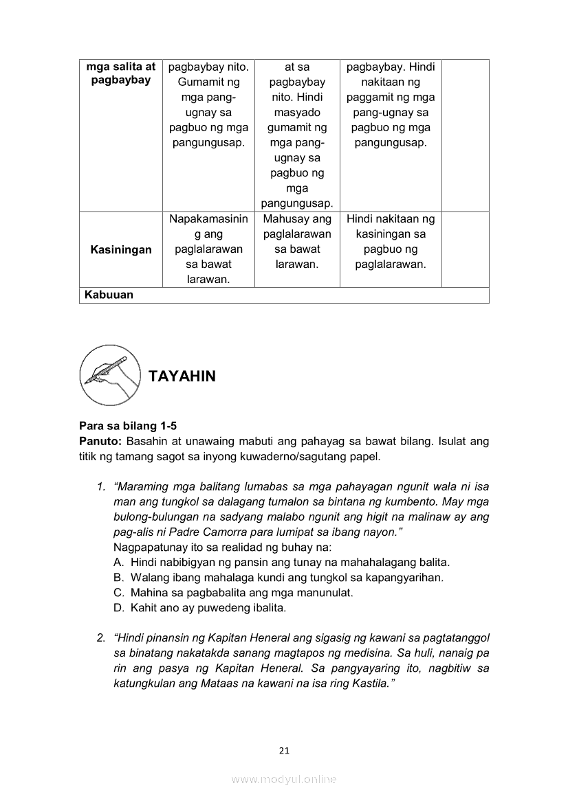 Filipino 10 Ikaapat na Markahan – Modyul 8 PAGSUSURI SA PILING KABANATA NG EL FILIBUSTERISMO NA KAKIKITAAN NG KLASIKONG KATANGIAN NG AKDA Sub-Aralin: Mga Pang-uring Umaakit sa Imahinasyon at mga PandamaMay 28, 2021 Grade 10Xiaomi Redmi Watch 5 Active 2inch LCD Display Clear Calling 5ATM Waterproof Smart Watch for only ₱3,999 ₱1,200!. Filipino 10 4th QuarterRelatedFilipino 10 Ikaapat na Markahan – Modyul 7 KABULUHAN NG MGA KAISIPANG LUTANG SA PILING KABANATA NG EL FILIBUSTERISMO KAUGNAY KAY SIMOUN Sub-Aralin: Pagbibigay-kahulugan ng Matatalinghagang PahayagFilipino 10 Ikaapat na Markahan – Modyul 1 KALIGIRANG PANGKASAYSAYAN NG EL FILIBUSTERISMOFilipino 10 Ikaapat na Markahan – Modyul 4 PAGSUSURI SA PILING KABANATA NG EL FILIBUSTERISMO Sub-Aralin: Pagbubuod Gamit ang Tamang Mekaniks sa PagsulatFilipino 10 Ikaapat na Markahan – Modyul 5 ANG MGA KAISIPANG LUTANG SA AKDA (Sa Ilalim ng Kubyerta, Sa Bahay ng mga Estudyante, Ginoong Pasta, Ang Palabas, Ang Prayle at Ang mga Pilipino, Ang Piging at Ang Hiwaga)Filipino 10 Ikaapat na Markahan – Modyul 2 PAGSULAT NG BUOD HANGO SA TIMELINE (Kaligirang Pangkasaysayan ng El Filibusterismo)
