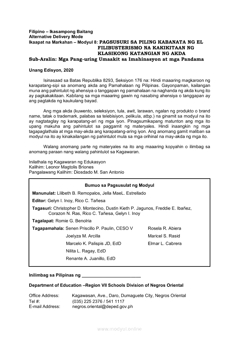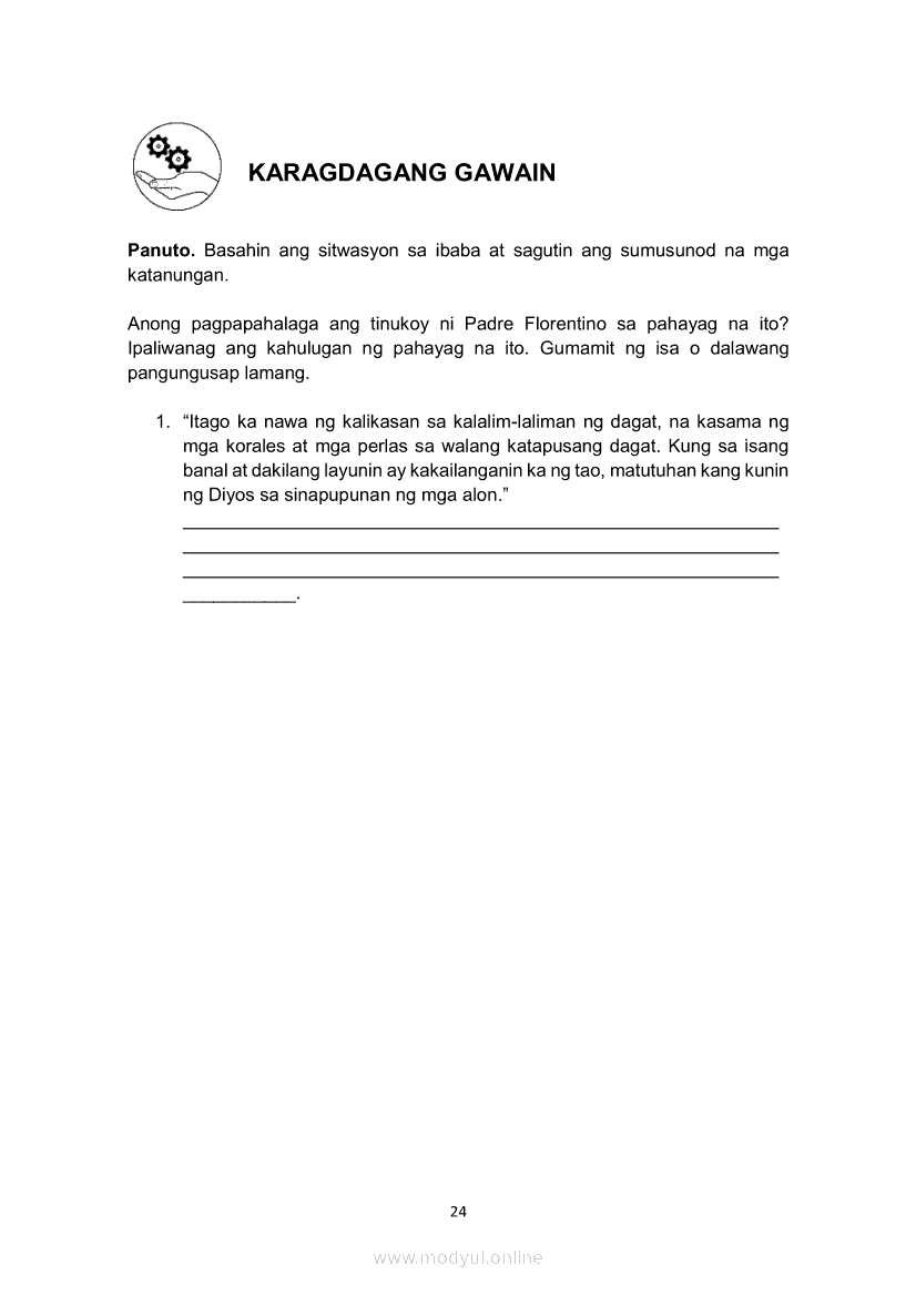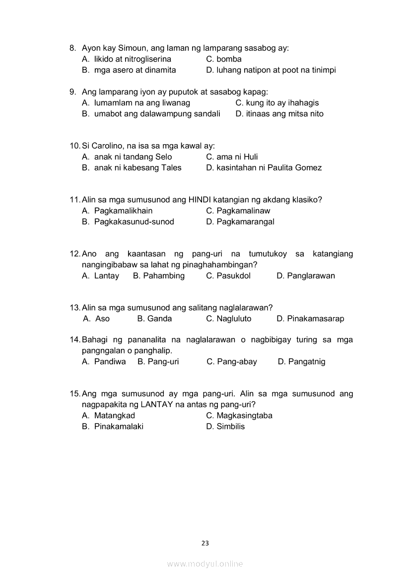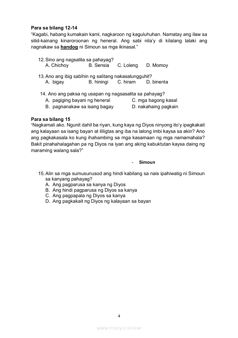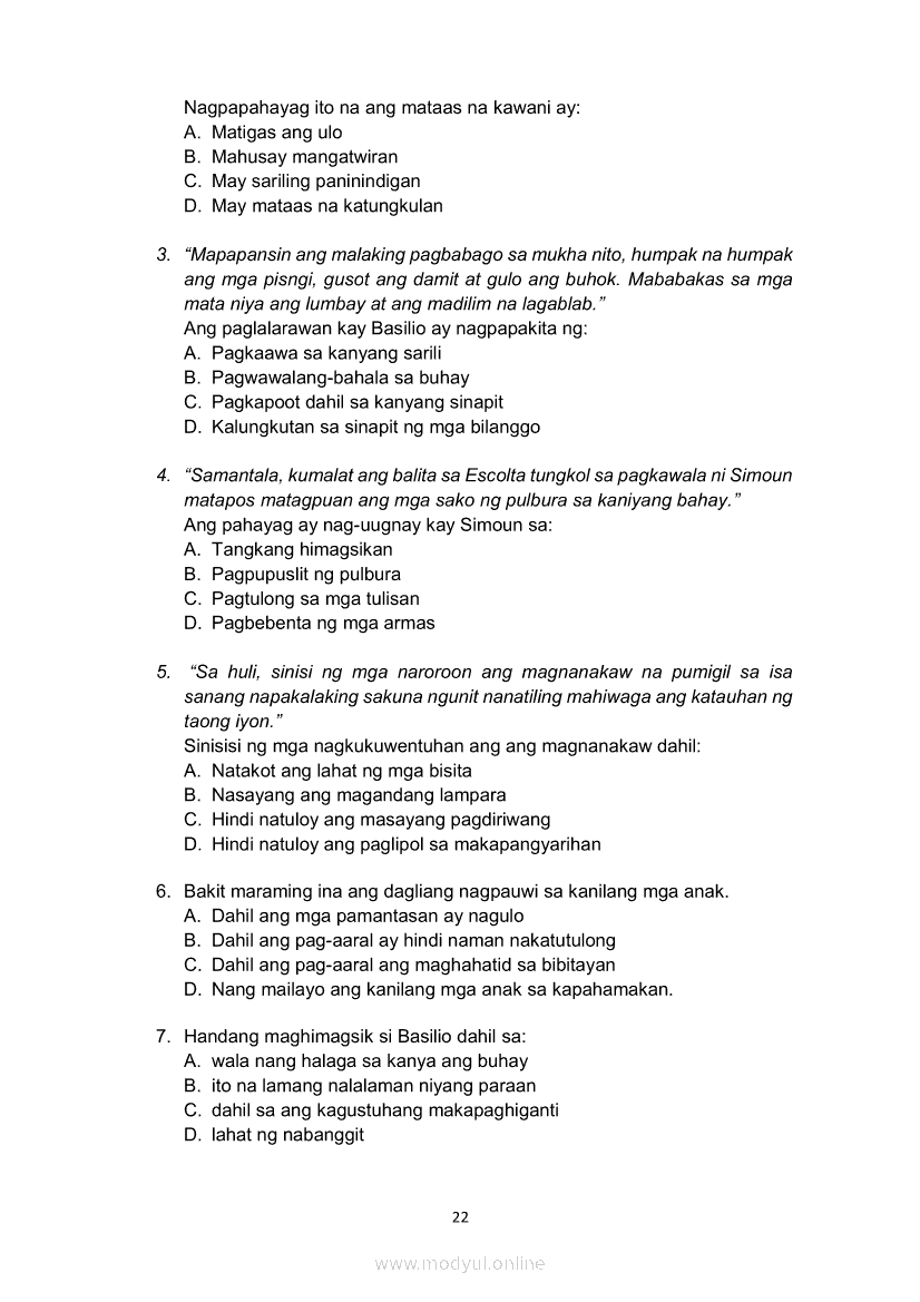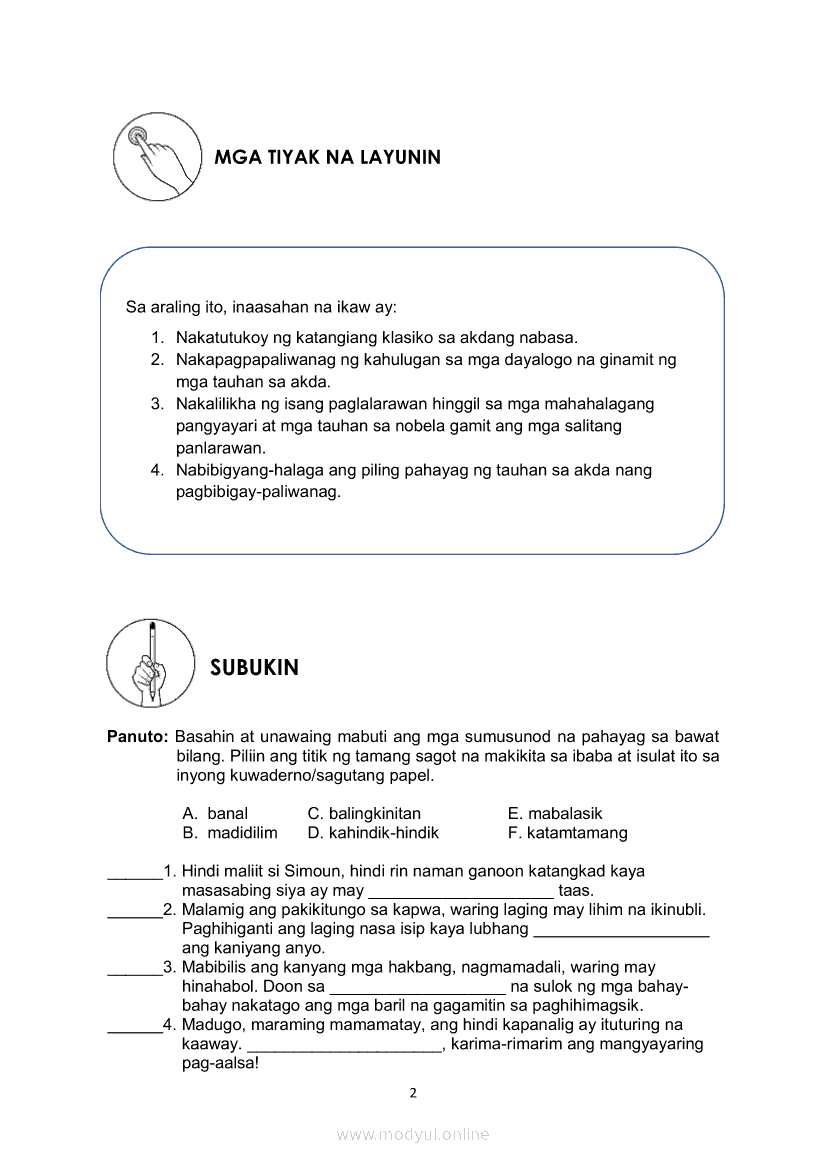 Filipino 10 Ikaapat na Markahan – Modyul 8 PAGSUSURI SA PILING KABANATA NG EL FILIBUSTERISMO NA KAKIKITAAN NG KLASIKONG KATANGIAN NG AKDA Sub-Aralin: Mga Pang-uring Umaakit sa Imahinasyon at mga PandamaMay 28, 2021 Grade 10Xiaomi Redmi Watch 5 Active 2inch LCD Display Clear Calling 5ATM Waterproof Smart Watch for only ₱3,999 ₱1,200!. Filipino 10 4th QuarterRelatedFilipino 10 Ikaapat na Markahan – Modyul 7 KABULUHAN NG MGA KAISIPANG LUTANG SA PILING KABANATA NG EL FILIBUSTERISMO KAUGNAY KAY SIMOUN Sub-Aralin: Pagbibigay-kahulugan ng Matatalinghagang PahayagFilipino 10 Ikaapat na Markahan – Modyul 1 KALIGIRANG PANGKASAYSAYAN NG EL FILIBUSTERISMOFilipino 10 Ikaapat na Markahan – Modyul 4 PAGSUSURI SA PILING KABANATA NG EL FILIBUSTERISMO Sub-Aralin: Pagbubuod Gamit ang Tamang Mekaniks sa PagsulatFilipino 10 Ikaapat na Markahan – Modyul 5 ANG MGA KAISIPANG LUTANG SA AKDA (Sa Ilalim ng Kubyerta, Sa Bahay ng mga Estudyante, Ginoong Pasta, Ang Palabas, Ang Prayle at Ang mga Pilipino, Ang Piging at Ang Hiwaga)Filipino 10 Ikaapat na Markahan – Modyul 2 PAGSULAT NG BUOD HANGO SA TIMELINE (Kaligirang Pangkasaysayan ng El Filibusterismo)