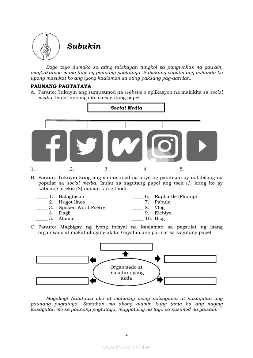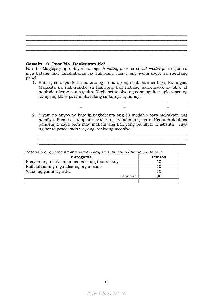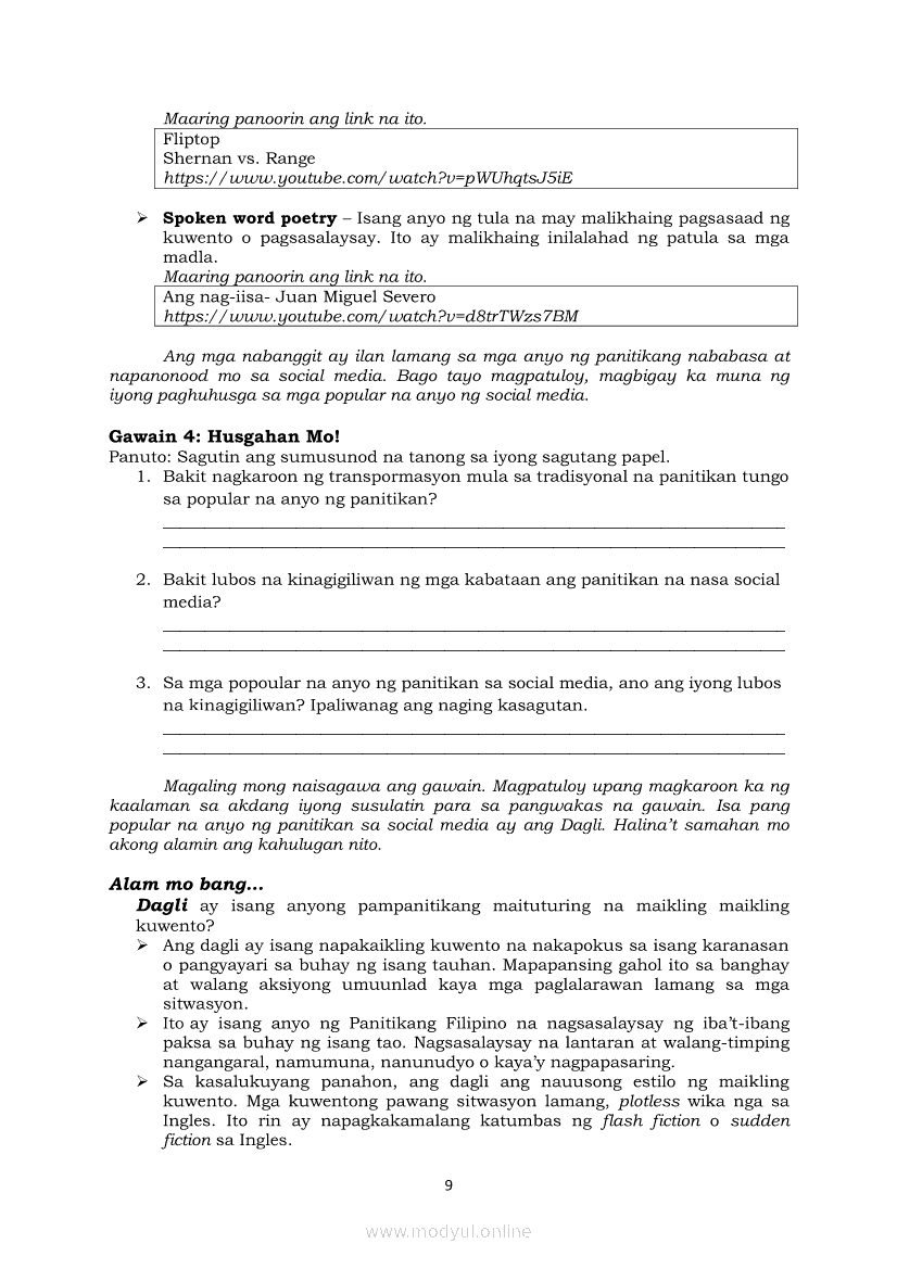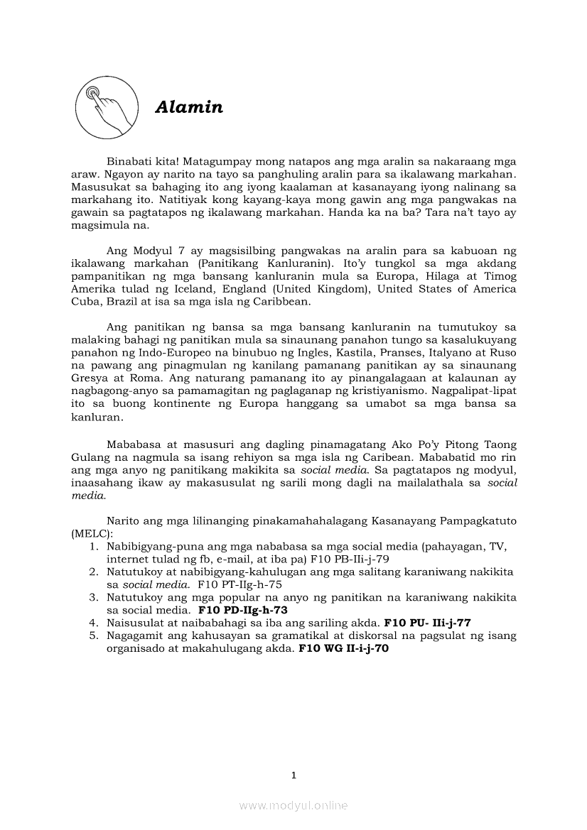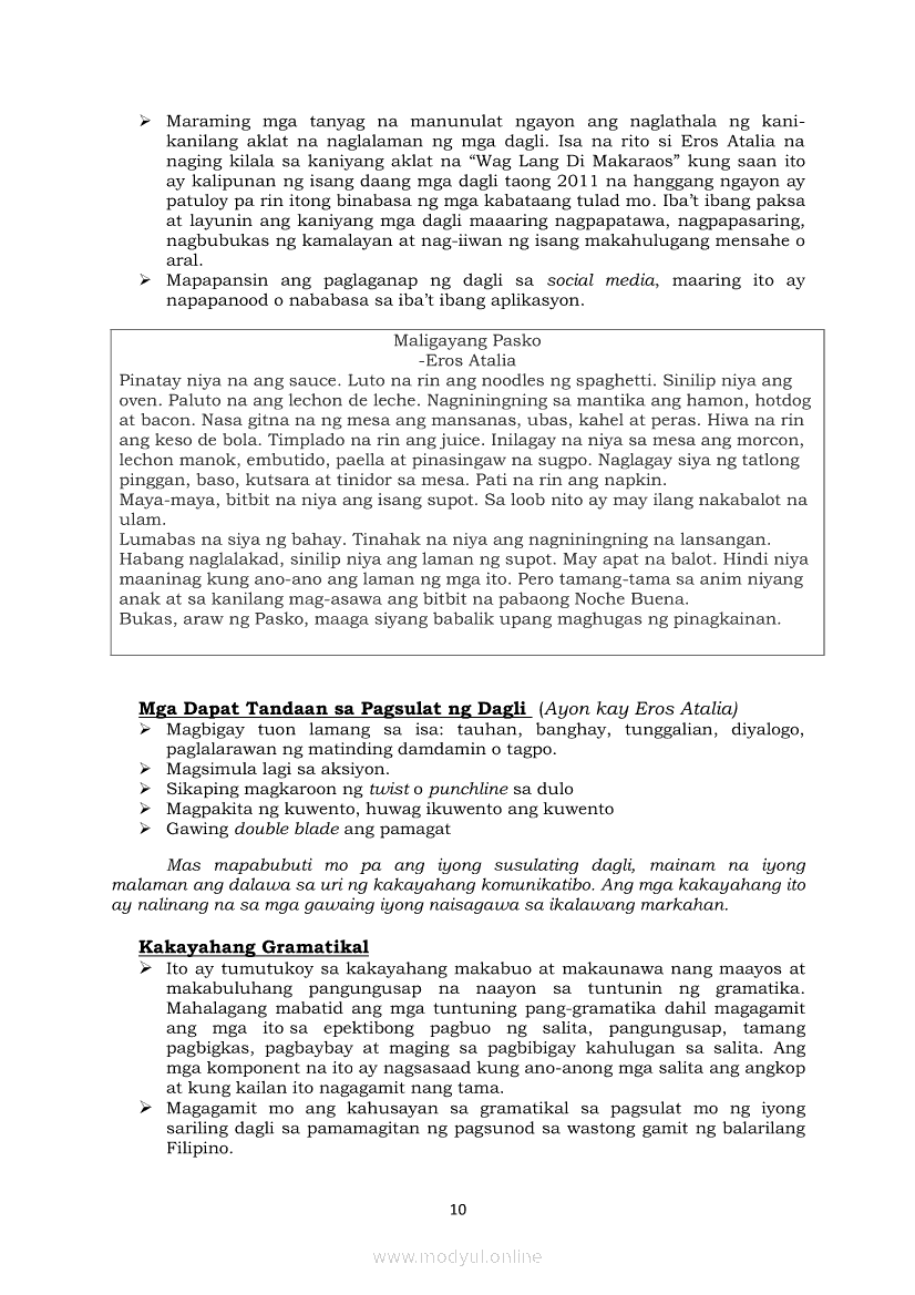 Filipino 10 Ikalawang Markahan – Modyul 7: Pangwakas na Gawain sa Panitikang KanluraninApr 22, 2021 Grade 10Xiaomi Redmi Watch 5 Active 2inch LCD Display Clear Calling 5ATM Waterproof Smart Watch for only ₱3,999 ₱1,200!. Filipino 10RelatedFilipino 10 Ikaapat na Markahan – Modyul 4 PAGSUSURI SA PILING KABANATA NG EL FILIBUSTERISMO Sub-Aralin: Pagbubuod Gamit ang Tamang Mekaniks sa PagsulatFilipino 10 Ikaapat na Markahan – Modyul 1 KALIGIRANG PANGKASAYSAYAN NG EL FILIBUSTERISMOFilipino 10 Ikaapat na Markahan – Modyul 8 PAGSUSURI SA PILING KABANATA NG EL FILIBUSTERISMO NA KAKIKITAAN NG KLASIKONG KATANGIAN NG AKDA Sub-Aralin: Mga Pang-uring Umaakit sa Imahinasyon at mga PandamaFilipino 10 Ikaapat na Markahan – Modyul 5 ANG MGA KAISIPANG LUTANG SA AKDA (Sa Ilalim ng Kubyerta, Sa Bahay ng mga Estudyante, Ginoong Pasta, Ang Palabas, Ang Prayle at Ang mga Pilipino, Ang Piging at Ang Hiwaga)Filipino 10 Ikaapat na Markahan – Modyul 7 KABULUHAN NG MGA KAISIPANG LUTANG SA PILING KABANATA NG EL FILIBUSTERISMO KAUGNAY KAY SIMOUN Sub-Aralin: Pagbibigay-kahulugan ng Matatalinghagang Pahayag