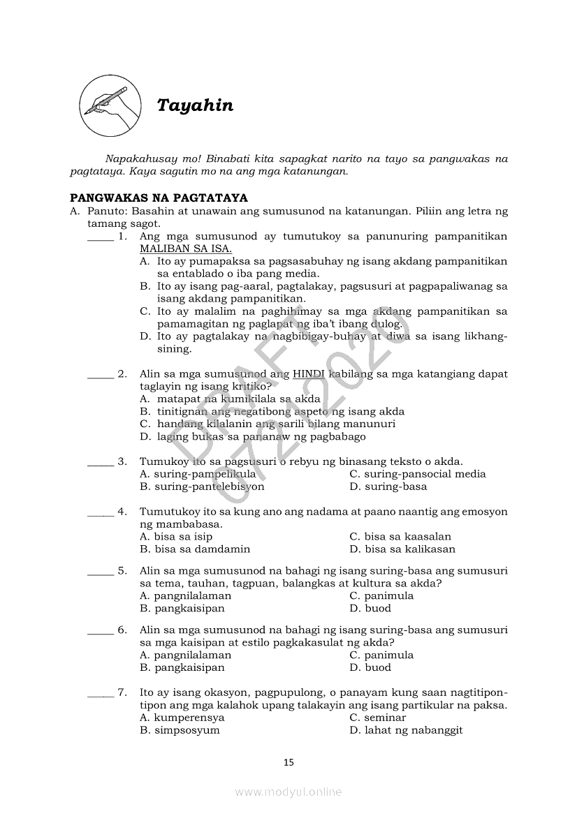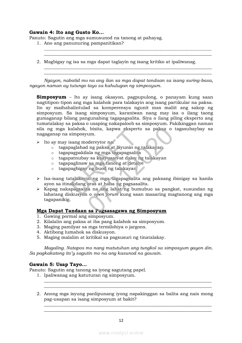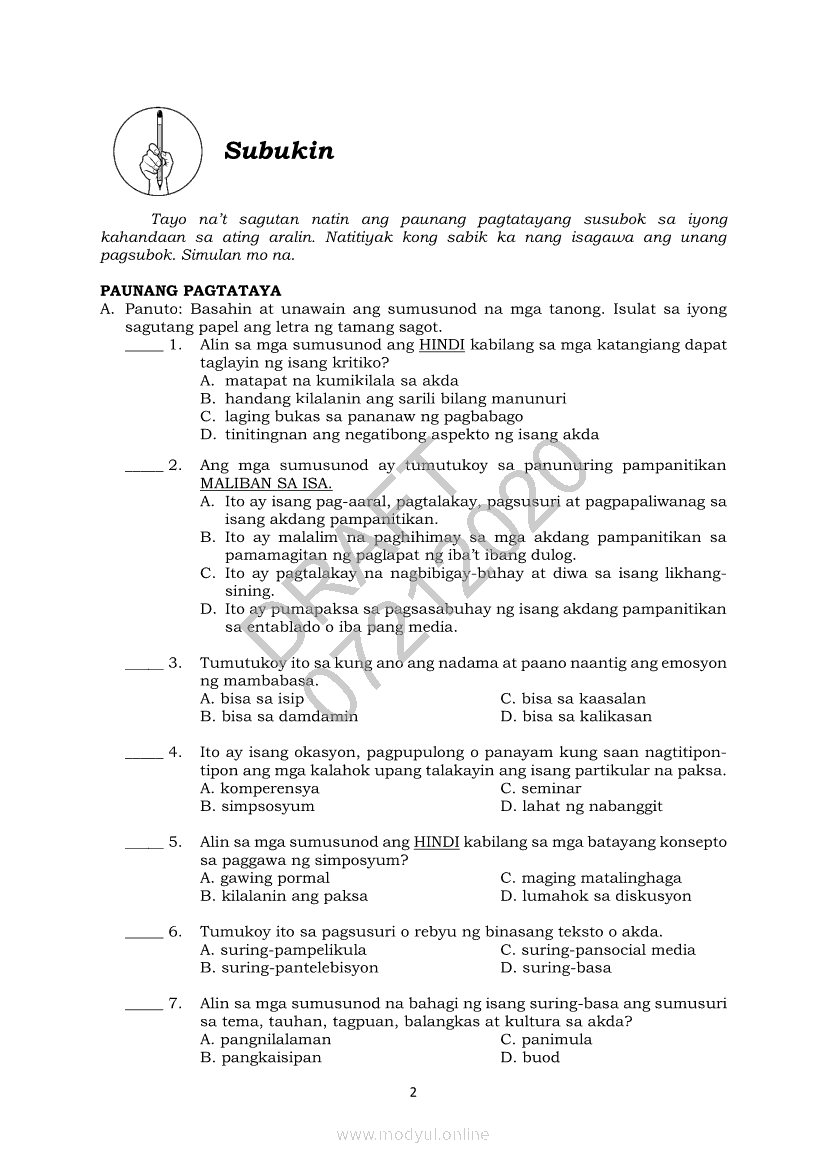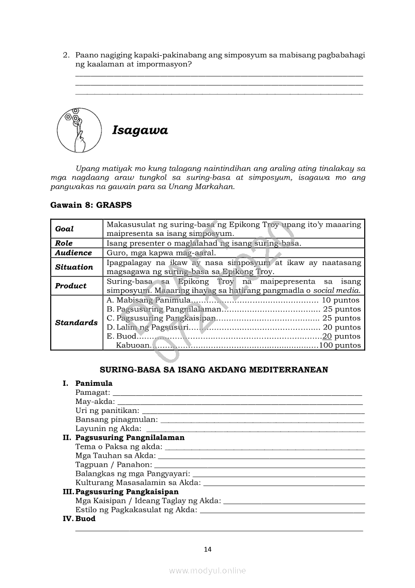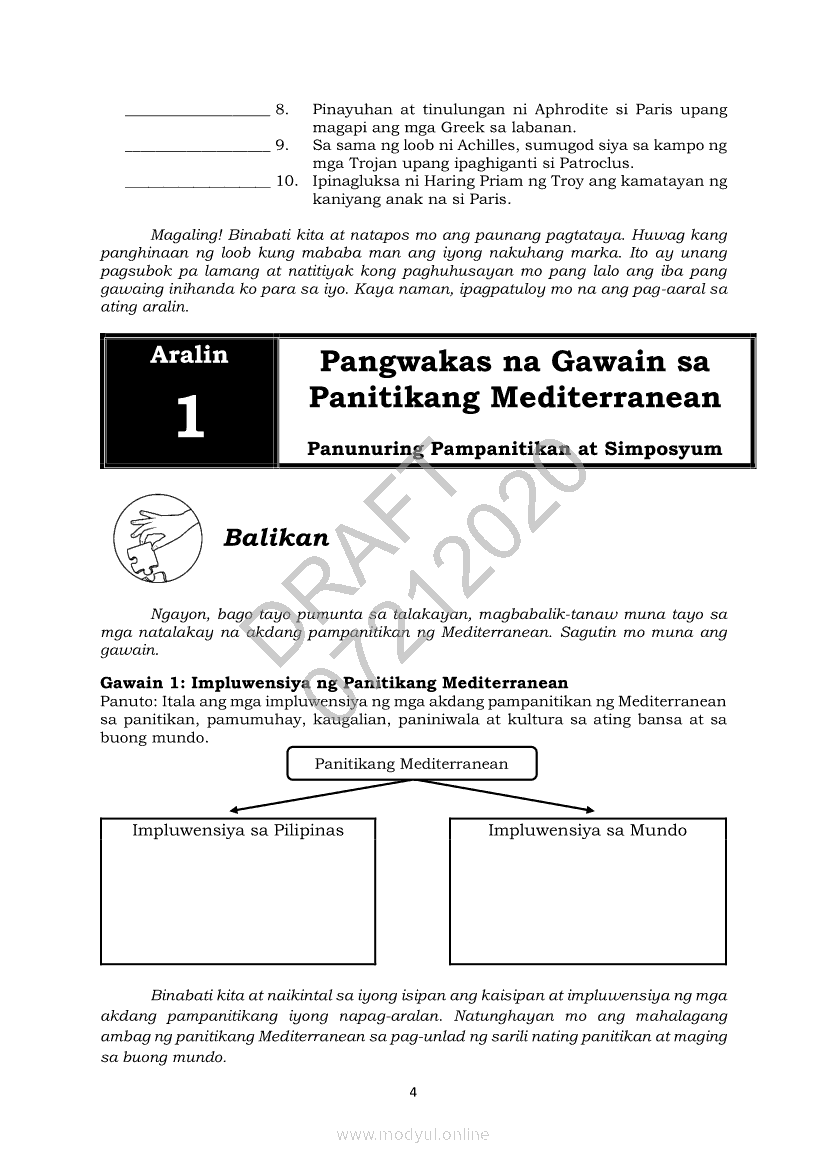 Filipino 10 Modyul 7: Pangwakas na Gawain sa Panitikang MediterraneanApr 22, 2021 Grade 10Xiaomi Redmi Watch 5 Active 2inch LCD Display Clear Calling 5ATM Waterproof Smart Watch for only ₱3,999 ₱1,200!. Filipino 10RelatedFilipino 10 Ikaapat na Markahan – Modyul 8 PAGSUSURI SA PILING KABANATA NG EL FILIBUSTERISMO NA KAKIKITAAN NG KLASIKONG KATANGIAN NG AKDA Sub-Aralin: Mga Pang-uring Umaakit sa Imahinasyon at mga PandamaFilipino 10 Ikaapat na Markahan – Modyul 2 PAGSULAT NG BUOD HANGO SA TIMELINE (Kaligirang Pangkasaysayan ng El Filibusterismo)Filipino 10 Ikaapat na Markahan – Modyul 7 KABULUHAN NG MGA KAISIPANG LUTANG SA PILING KABANATA NG EL FILIBUSTERISMO KAUGNAY KAY SIMOUN Sub-Aralin: Pagbibigay-kahulugan ng Matatalinghagang PahayagFilipino 10 Ikaapat na Markahan – Modyul 5 ANG MGA KAISIPANG LUTANG SA AKDA (Sa Ilalim ng Kubyerta, Sa Bahay ng mga Estudyante, Ginoong Pasta, Ang Palabas, Ang Prayle at Ang mga Pilipino, Ang Piging at Ang Hiwaga)Filipino 10 Ikaapat na Markahan – Modyul 4 PAGSUSURI SA PILING KABANATA NG EL FILIBUSTERISMO Sub-Aralin: Pagbubuod Gamit ang Tamang Mekaniks sa Pagsulat