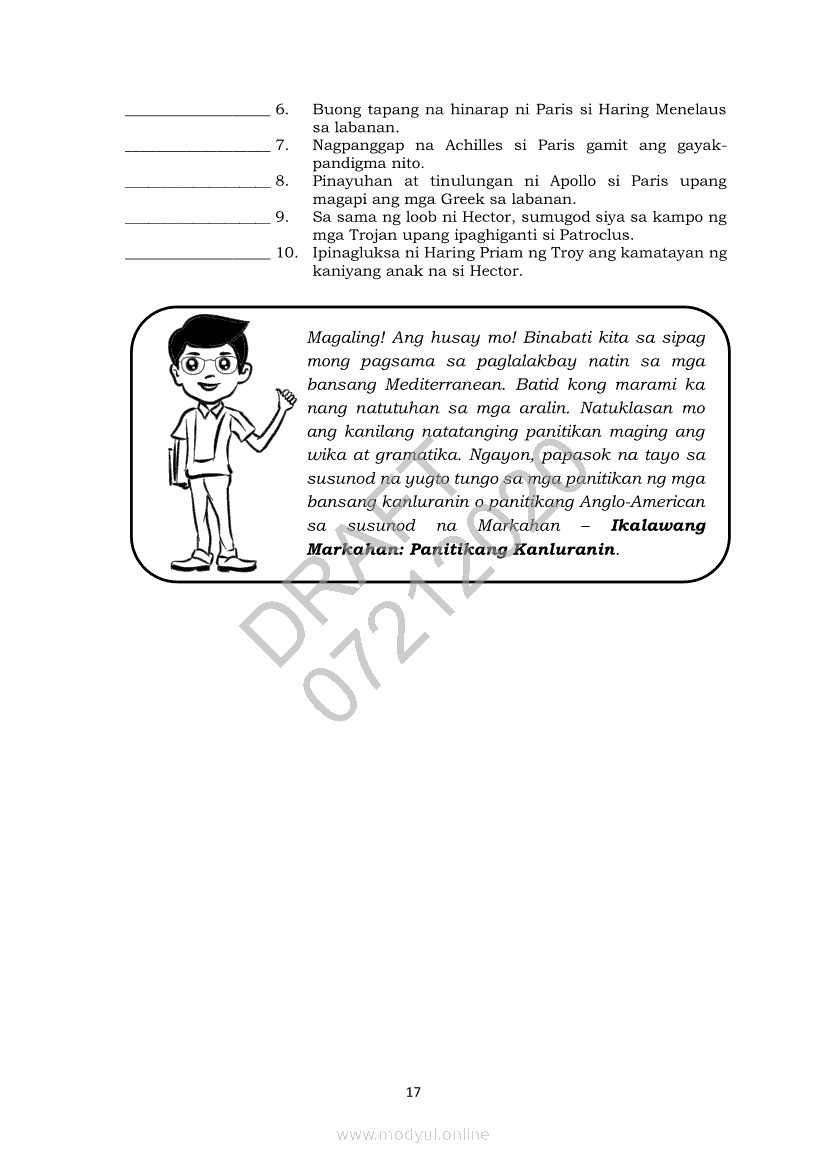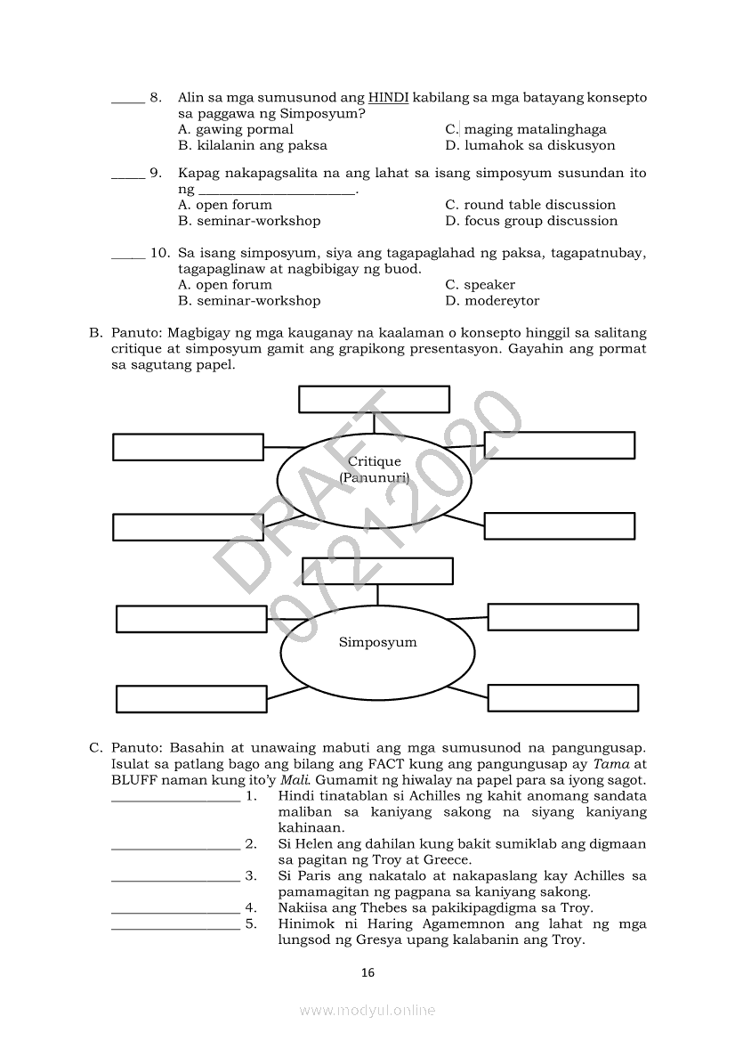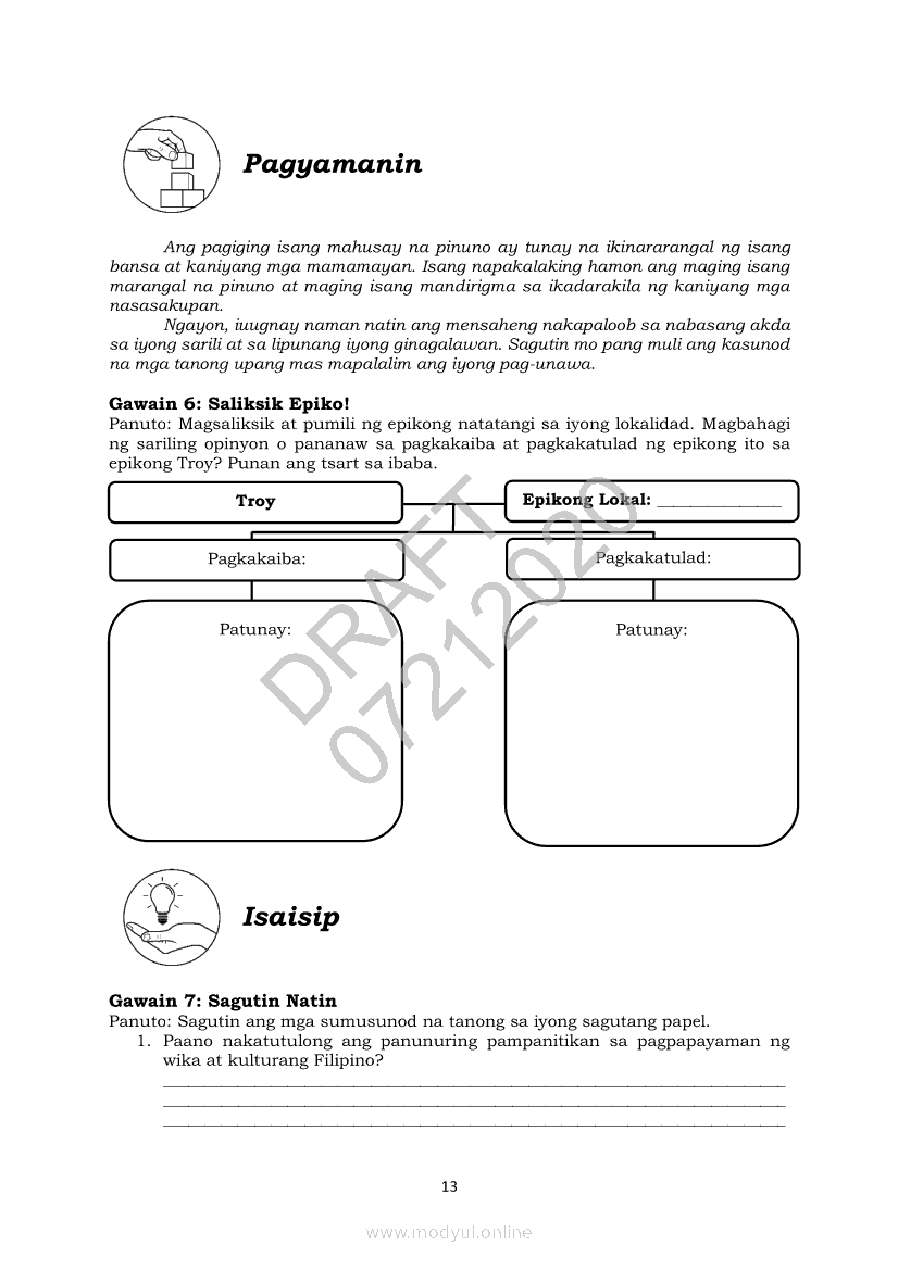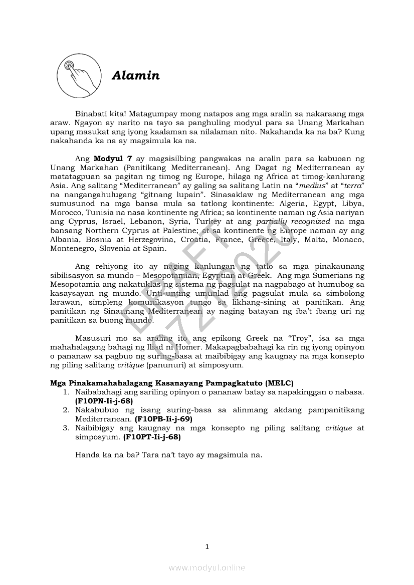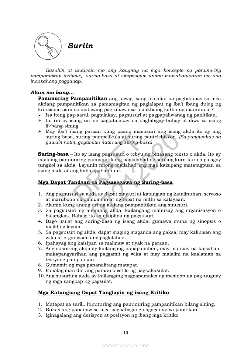 Filipino 10 Modyul 7: Pangwakas na Gawain sa Panitikang MediterraneanApr 22, 2021 Grade 10Xiaomi Redmi Watch 5 Active 2inch LCD Display Clear Calling 5ATM Waterproof Smart Watch for only ₱3,999 ₱1,200!. Filipino 10RelatedFilipino 10 Ikaapat na Markahan – Modyul 8 PAGSUSURI SA PILING KABANATA NG EL FILIBUSTERISMO NA KAKIKITAAN NG KLASIKONG KATANGIAN NG AKDA Sub-Aralin: Mga Pang-uring Umaakit sa Imahinasyon at mga PandamaFilipino 10 Ikaapat na Markahan – Modyul 2 PAGSULAT NG BUOD HANGO SA TIMELINE (Kaligirang Pangkasaysayan ng El Filibusterismo)Filipino 10 Ikaapat na Markahan – Modyul 7 KABULUHAN NG MGA KAISIPANG LUTANG SA PILING KABANATA NG EL FILIBUSTERISMO KAUGNAY KAY SIMOUN Sub-Aralin: Pagbibigay-kahulugan ng Matatalinghagang PahayagFilipino 10 Ikaapat na Markahan – Modyul 5 ANG MGA KAISIPANG LUTANG SA AKDA (Sa Ilalim ng Kubyerta, Sa Bahay ng mga Estudyante, Ginoong Pasta, Ang Palabas, Ang Prayle at Ang mga Pilipino, Ang Piging at Ang Hiwaga)Filipino 10 Ikaapat na Markahan – Modyul 4 PAGSUSURI SA PILING KABANATA NG EL FILIBUSTERISMO Sub-Aralin: Pagbubuod Gamit ang Tamang Mekaniks sa Pagsulat