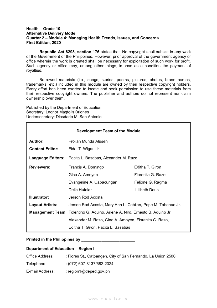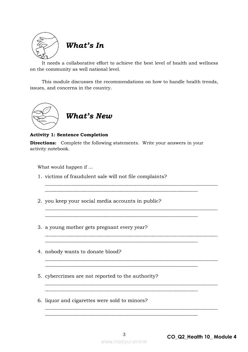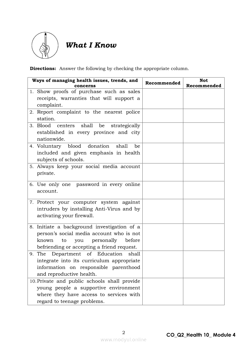 Health 10 Quarter 2 – Module 4: Managing Health Trends, Issues, and ConcernsApr 22, 2021 Grade 10Xiaomi Redmi Watch 5 Active 2inch LCD Display Clear Calling 5ATM Waterproof Smart Watch for only ₱3,999 ₱1,200!. Health 10RelatedHealth Quarter 4 – Module 4b: Professional Health Career Planning; Health PathwaysHealth Quarter 4 – Module 4a: Professional Health Career PlanningHealth 10 Module 1: Components of Consumer HealthHealth 10 Module 4: Consumer Welfare and ProtectionHealth 10 Module 3: Complementary and Alternative Healthcare Modalities