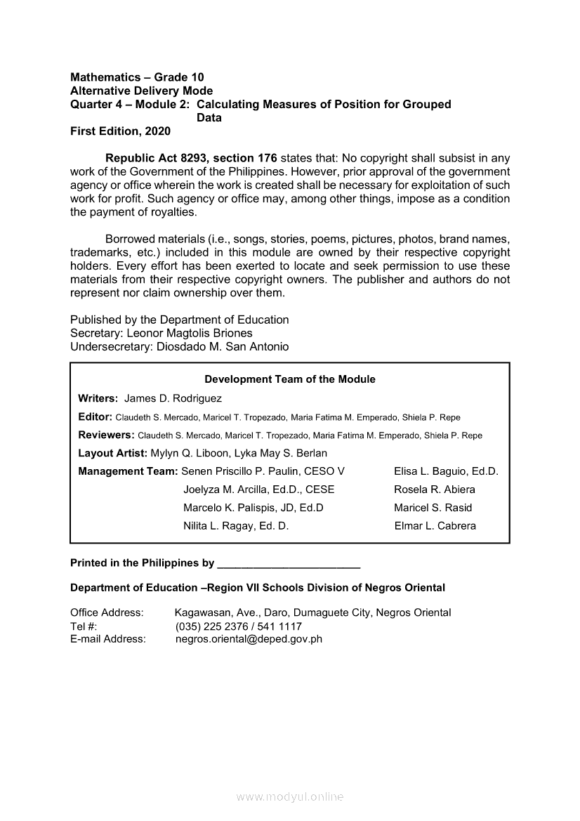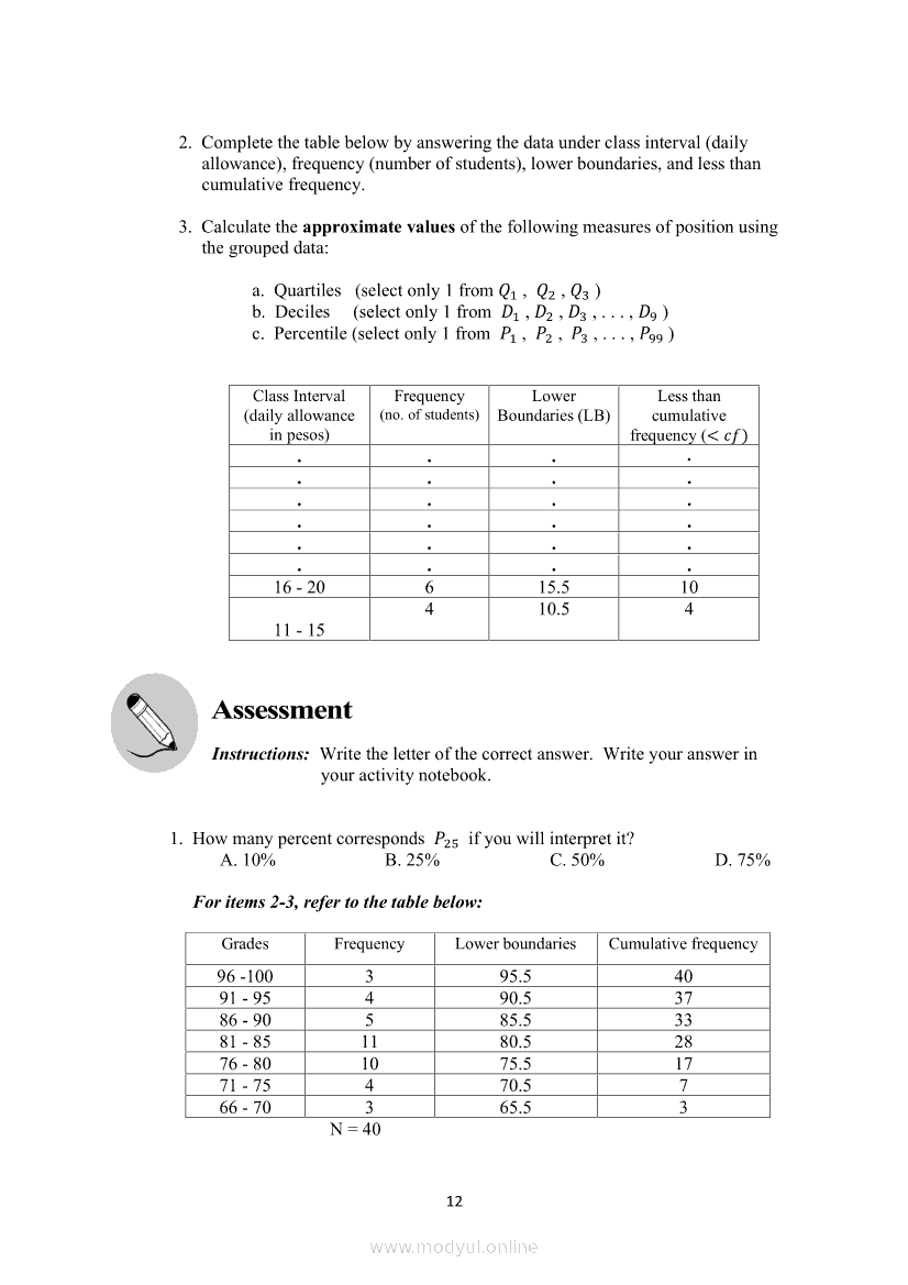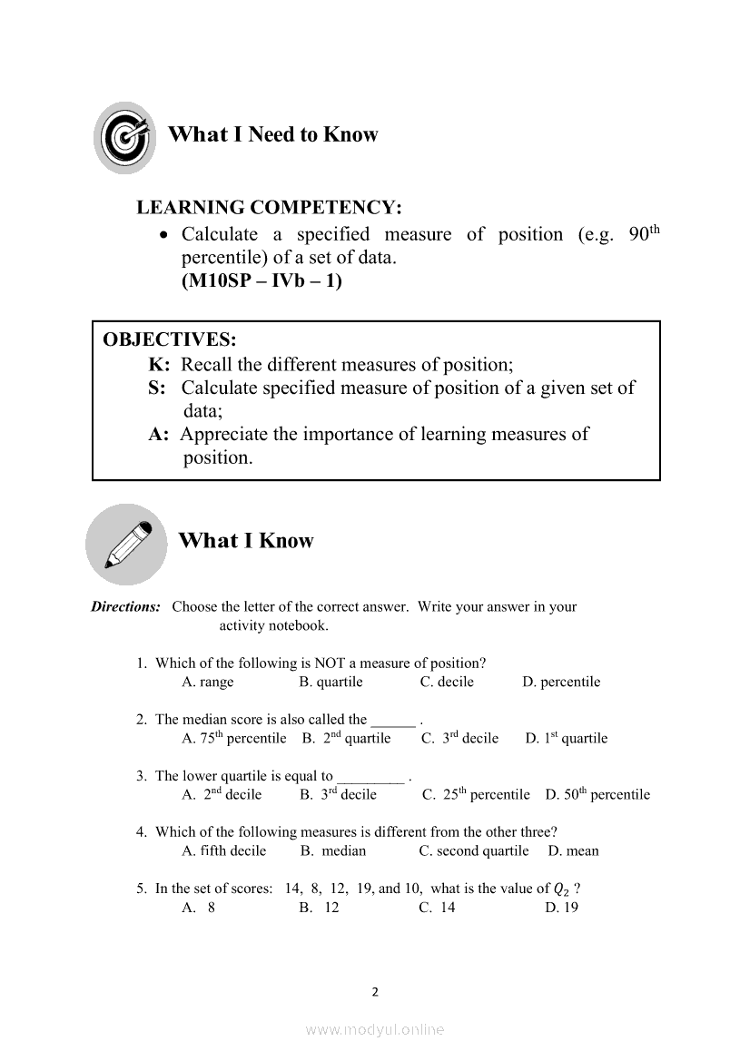 MATHEMATICS Quarter 4 – Module 2 Calculating Measures of Position for Grouped DataMay 28, 2021 Grade 10Xiaomi Redmi Watch 5 Active 2inch LCD Display Clear Calling 5ATM Waterproof Smart Watch for only ₱3,999 ₱1,200!. Math 10 4th QuarterRelatedMATHEMATICS Quarter 4 – Module 6 Measures of Position and Other Statistical MethodsMATHEMATICS Quarter 4 – Module 5 Statistical Mini-ResearchMATHEMATICS Quarter 4 – Module 3 Interpreting Measures of PositionMATHEMATICS Quarter 4 – Module 4 Solving Problems Involving Measures of PositionMATHEMATICS Quarter 4 – Module 1 Illustrating The Measures of Position for Ungrouped Data