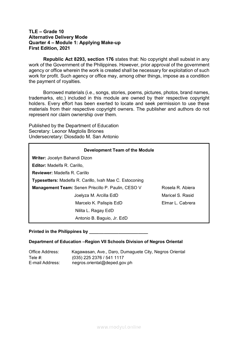 TLE - HE - HAIRDRESSING Quarter 4 - Module 1: APPLYING MAKE-UPMay 28, 2021 Grade 10Xiaomi Redmi Watch 5 Active 2inch LCD Display Clear Calling 5ATM Waterproof Smart Watch for only ₱3,999 ₱1,200!. TLE 10 4th QuarterRelatedTLE-IA-AUTOMOTIVE SERVICING NC 1 Quarter 4 – Module 5 & 6: Check Tire WearTLE – HE – DRESSMAKING Quarter 4 - Module 1: Prepare Cut PartsTLE - HE - COOKERY Quarter 4 – Module 2: Week 3 Cook Meat Cuts Meat Cooking MethodTLE-IA-CARPENTRY Quarter 4 – Module 1 (Week 1&2) IDENTIFY TYPES OF FORMWORKSTLE – ICT - CSS Quarter 4 – Module 1-8: INSTALL NETWORK CABLES,