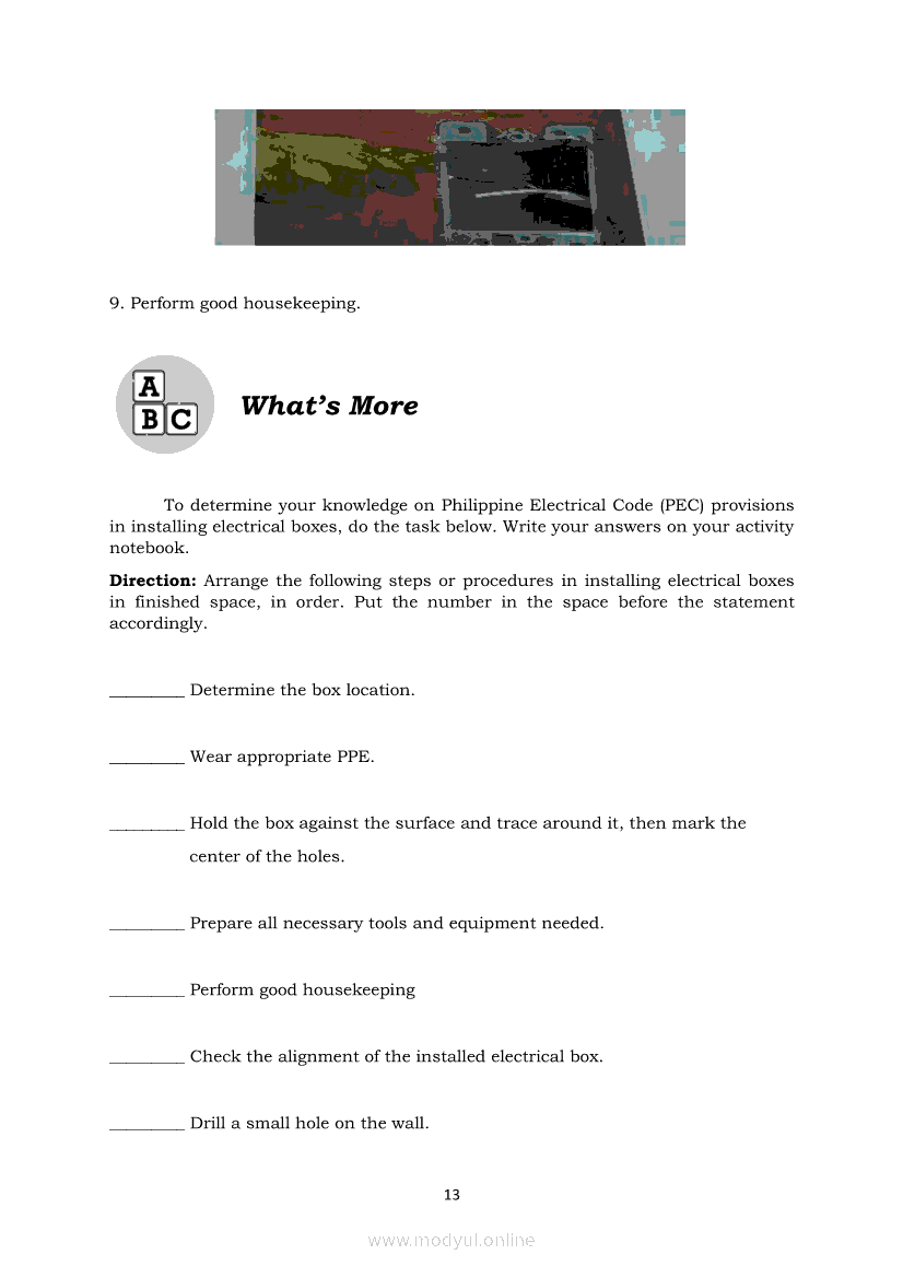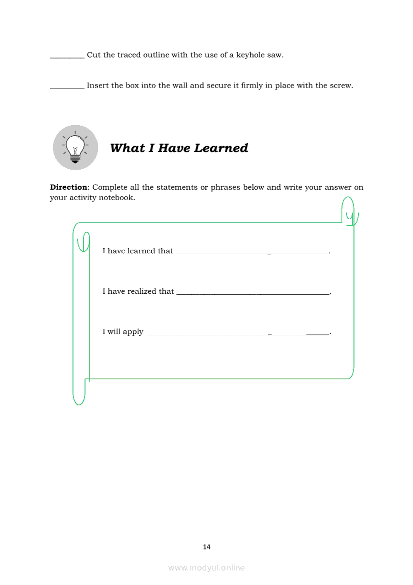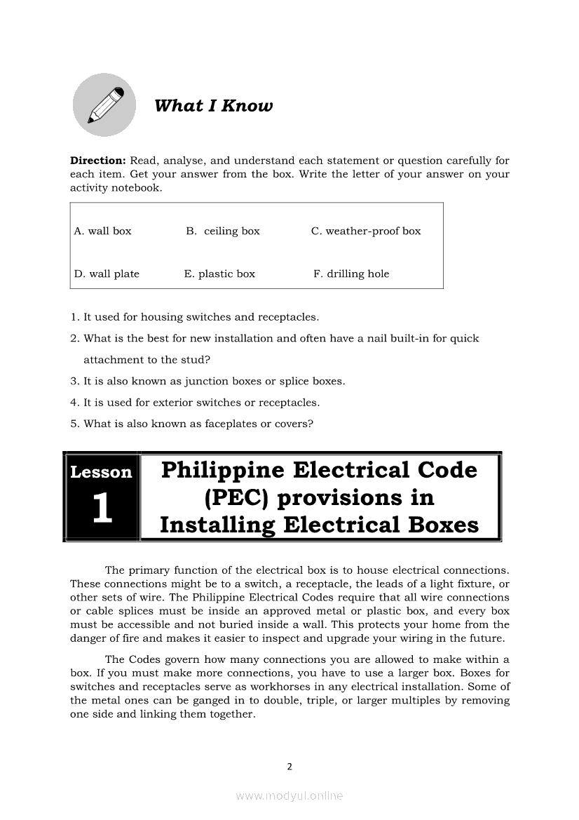 TLE–IA-EIM Quarter 4 – Module 1a (Week 1-2) Philippine Electrical Code (PEC) provisions in Installing Electrical BoxesMay 28, 2021 Grade 10Xiaomi Redmi Watch 5 Active 2inch LCD Display Clear Calling 5ATM Waterproof Smart Watch for only ₱3,999 ₱1,200!. TLE 10 4th QuarterRelatedTLE - HE - COOKERY Quarter 4 – Module 1: Week 1-2 Cook Meat CutsTLE - HE - HAIRDRESSING Quarter 4 - Module 1: APPLYING MAKE-UPTLE-IA-CARPENTRY Quarter 4 – Module 1 (Week 1&2) IDENTIFY TYPES OF FORMWORKSTLE-IA-CARPENTRY Quarter 4 – Module 4 (Week 7&8) OBSERVE GOOD FORMWORKS REQUIREMENTSTLE -HE - HAIRDRESSING Quarter 4 - Module 2: APPLYING MAKE-UP “Perform Post Service Activities”